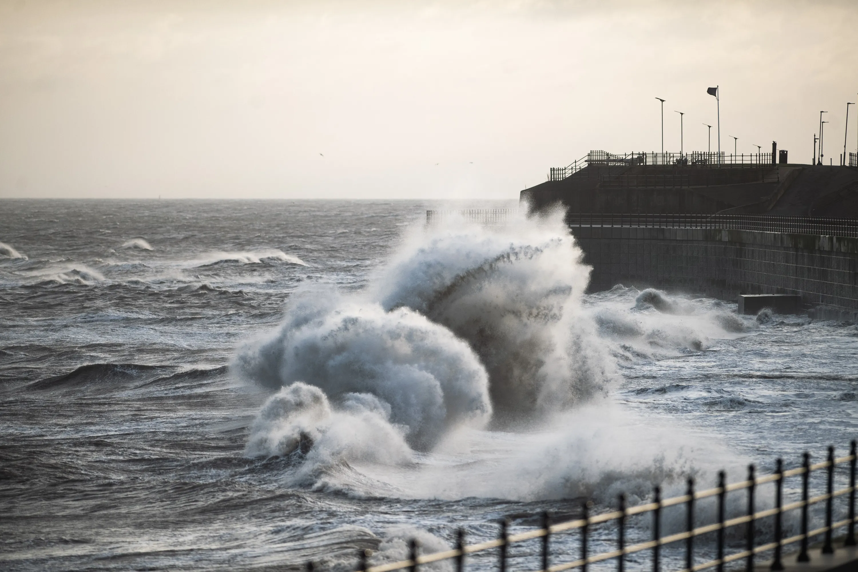 Waves crash against the Headland Promenade in Hartlepool, northeast England in the second decade of December 2023, as strong winds from Storm Pia battered the UK. (Photo by Jordan Crosby/The Times)