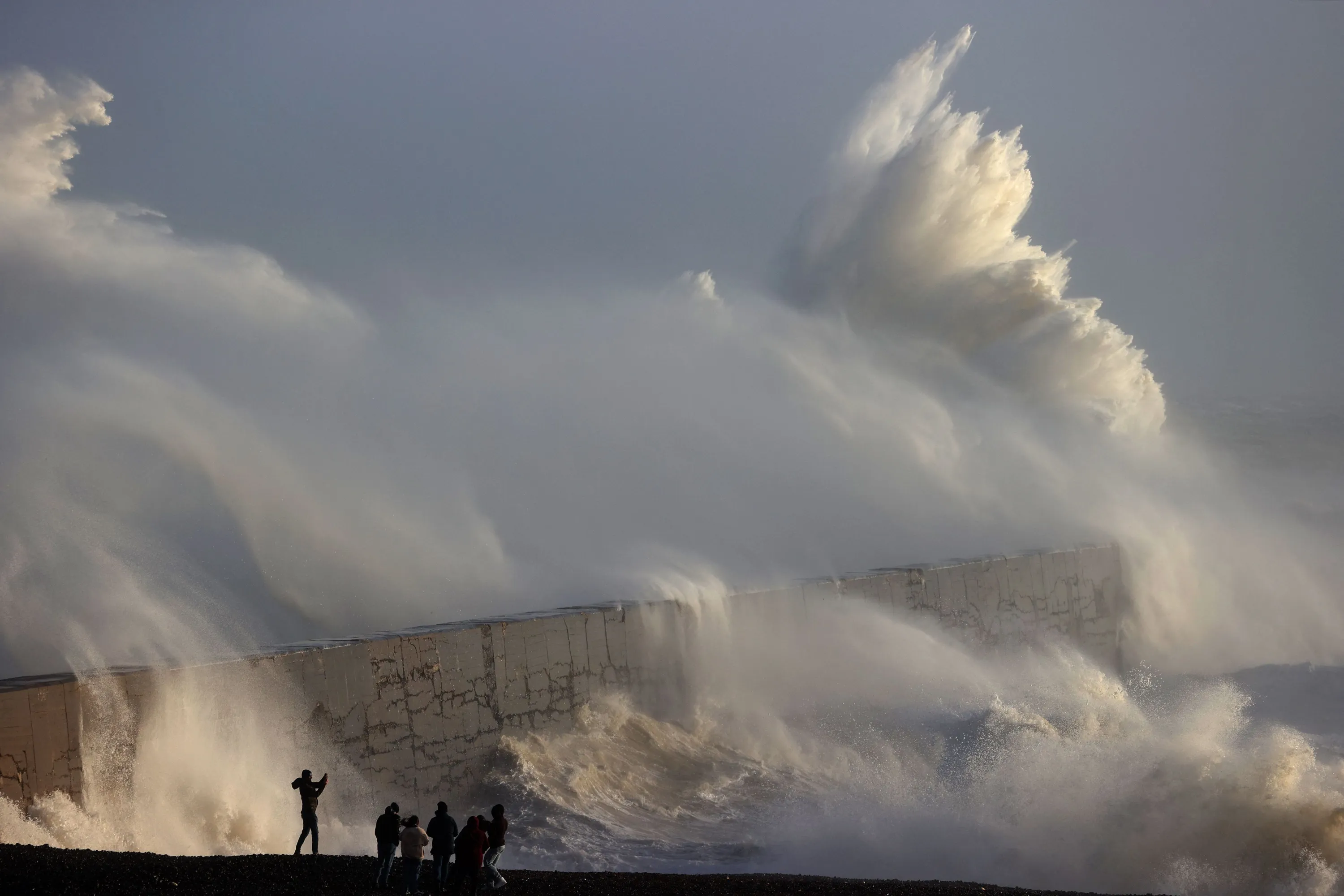 A person takes a photograph as waves break against the breakwater in Newhaven on January 2, 2024, as Storm Henk brought strong winds and heavy rain across much of southern England. (Photo by Adrian Dennis/AFP Photo)