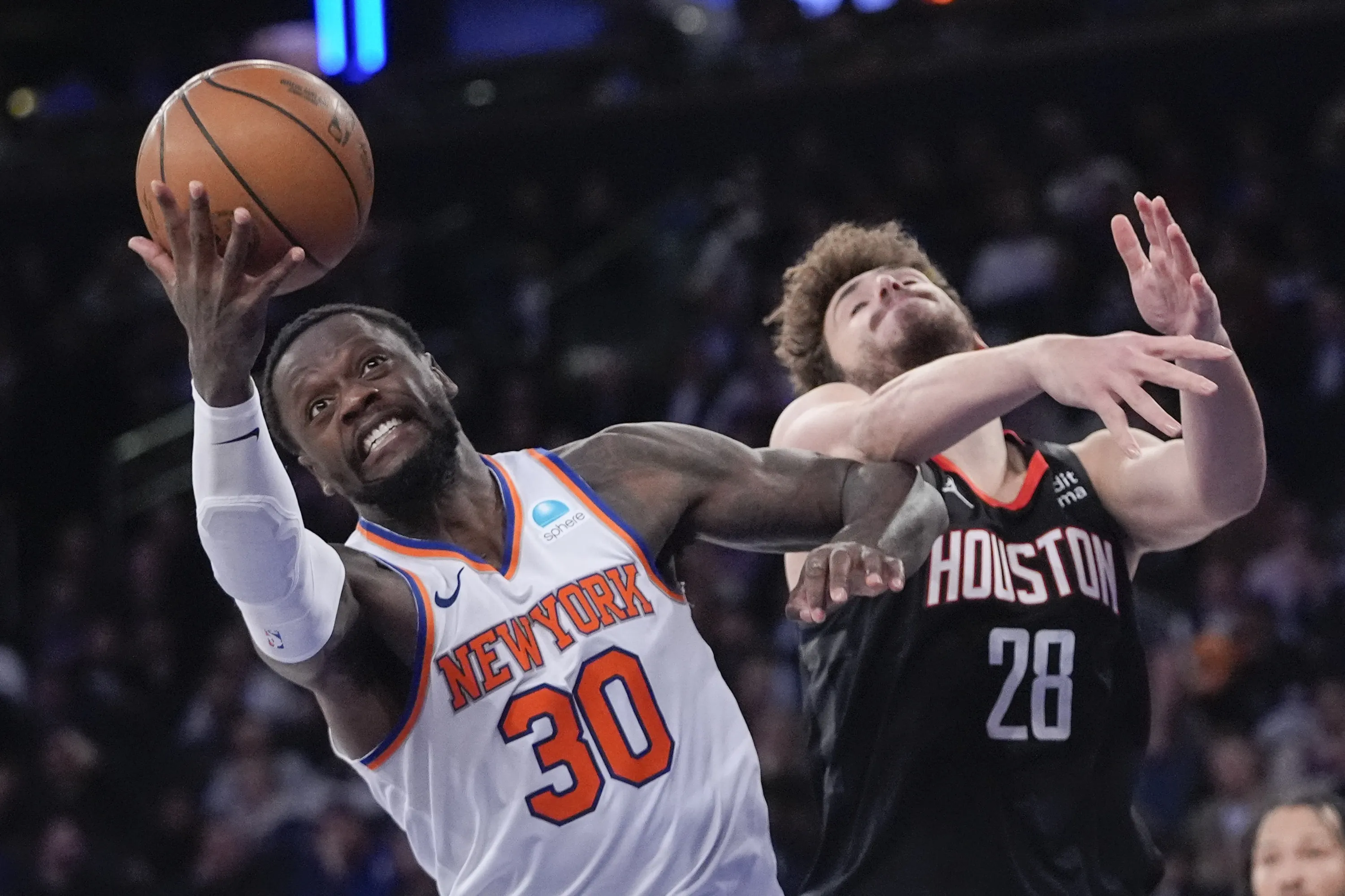 New York Knicks forward Julius Randle (30) and Houston Rockets center Alperen Sengun (28) fight for a rebound in the second half of an NBA basketball game, Wednesday, January 17, 2024, at Madison Square Garden in New York. (Photo by Mary Altaffer/AP Photo)
