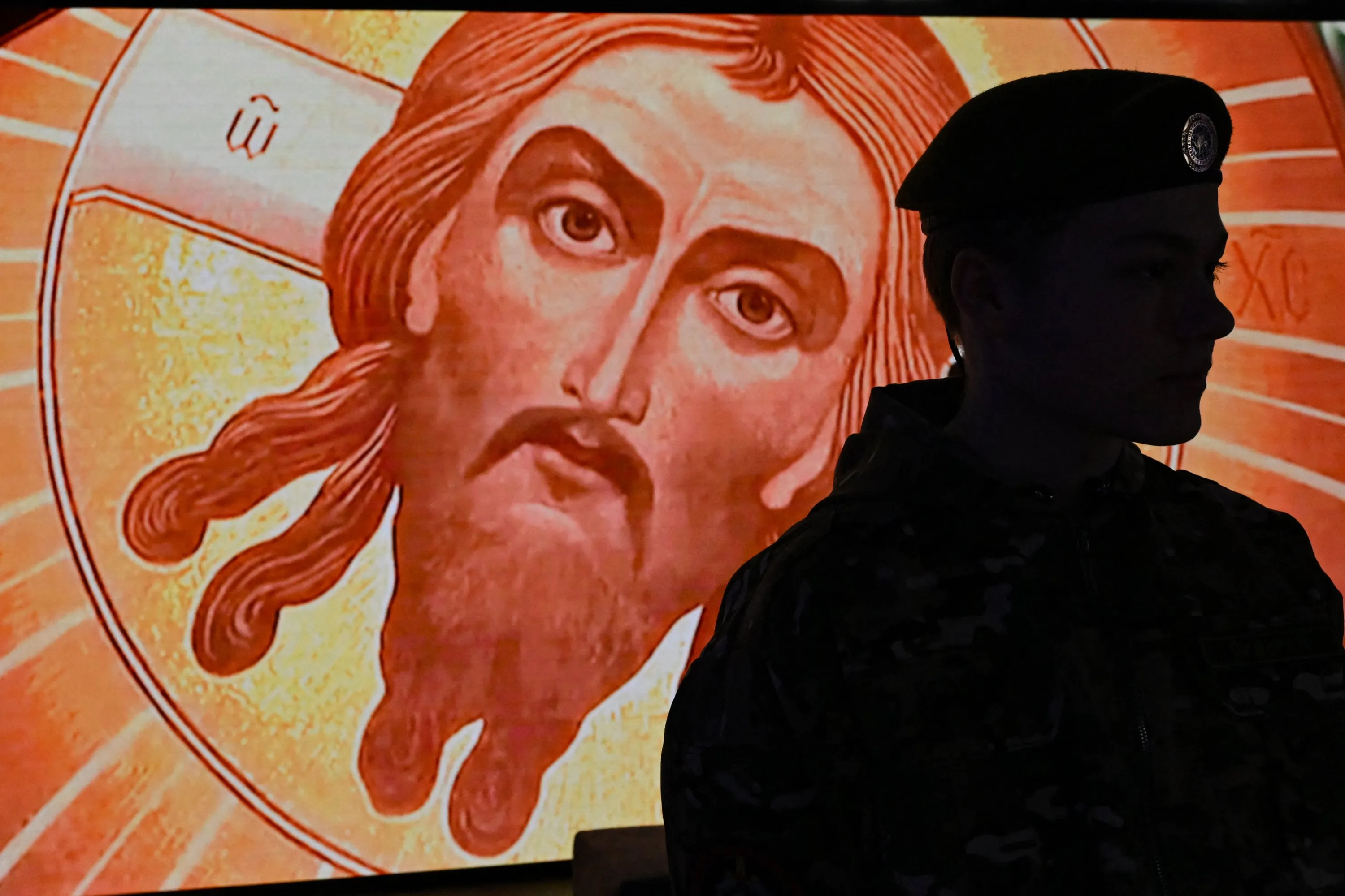 A visitor walks past a screen displaying an icon inside the Russian Defence Ministry pavilion at Russia Expo, an exhibition designed to demonstrate Russia's main achievements in culture and technology, at the All-Russia Exhibition Centre (VDNH) in Moscow on January 24, 2024. (Photo by Natalia Kolesnikova/AFP Photo)