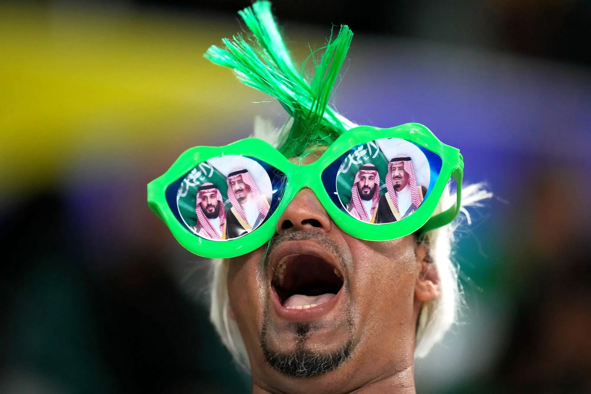 A supporter of Saudi Arabia shouts for his team ahead of the Asian Cup Group F soccer match between Saudi Arabia and Oman at Khalifa International Stadium in Doha, Qatar, Tuesday, January 16, 2024. (Photo by Aijaz Rahi/AP Photo)
