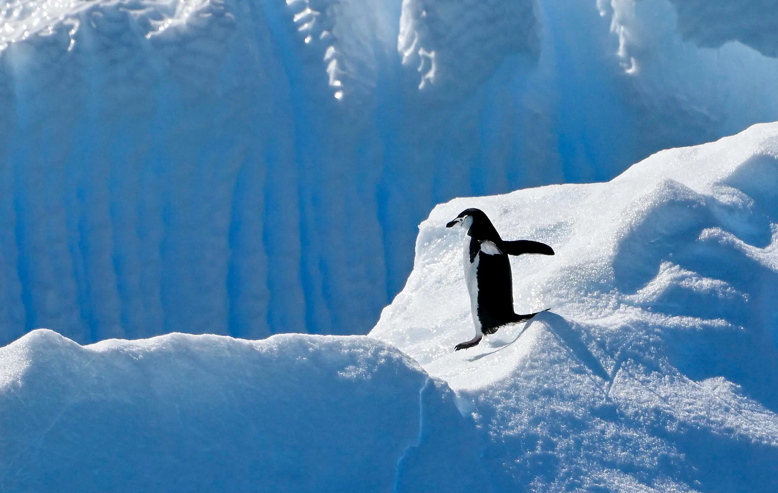 View of a chinstrap (Pygoscelis antarcticus) penguin at the Gerlache Strait -which separates the Palmer Archipelago from the Antarctic Peninsula, on January 15, 2024. (Photo by Juan Barreto/AFP Photo)