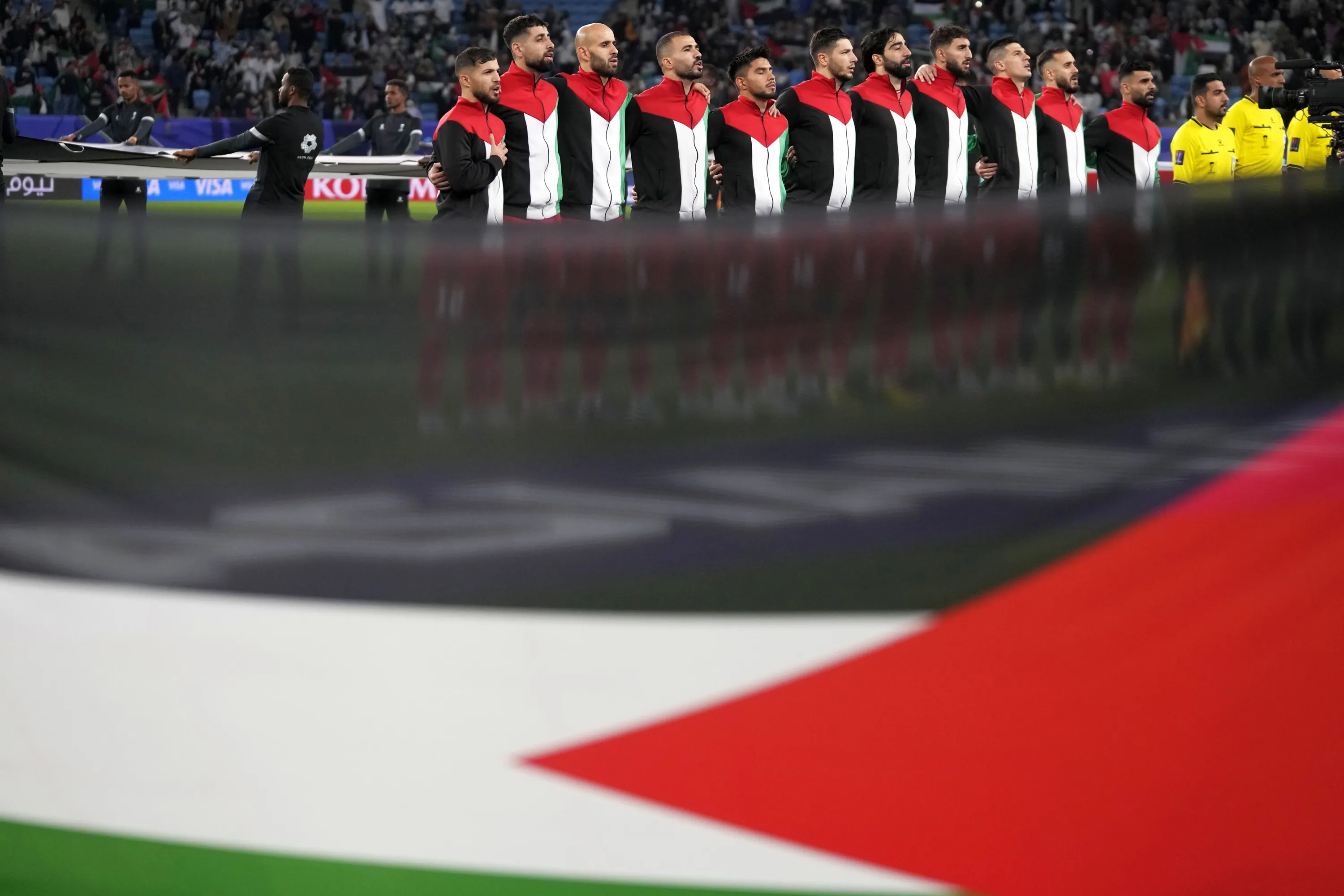 Players of team Palestine stand for their national anthem in front of a Palestinian flag prior to the start of the Asian Cup Group C soccer match between Palestine and United Arab Emirates at Al Janoub Stadium in Al Wakrah, Qatar, Thursday, January 18, 2024. (Photo by Thanassis Stavrakis/AP Photo)