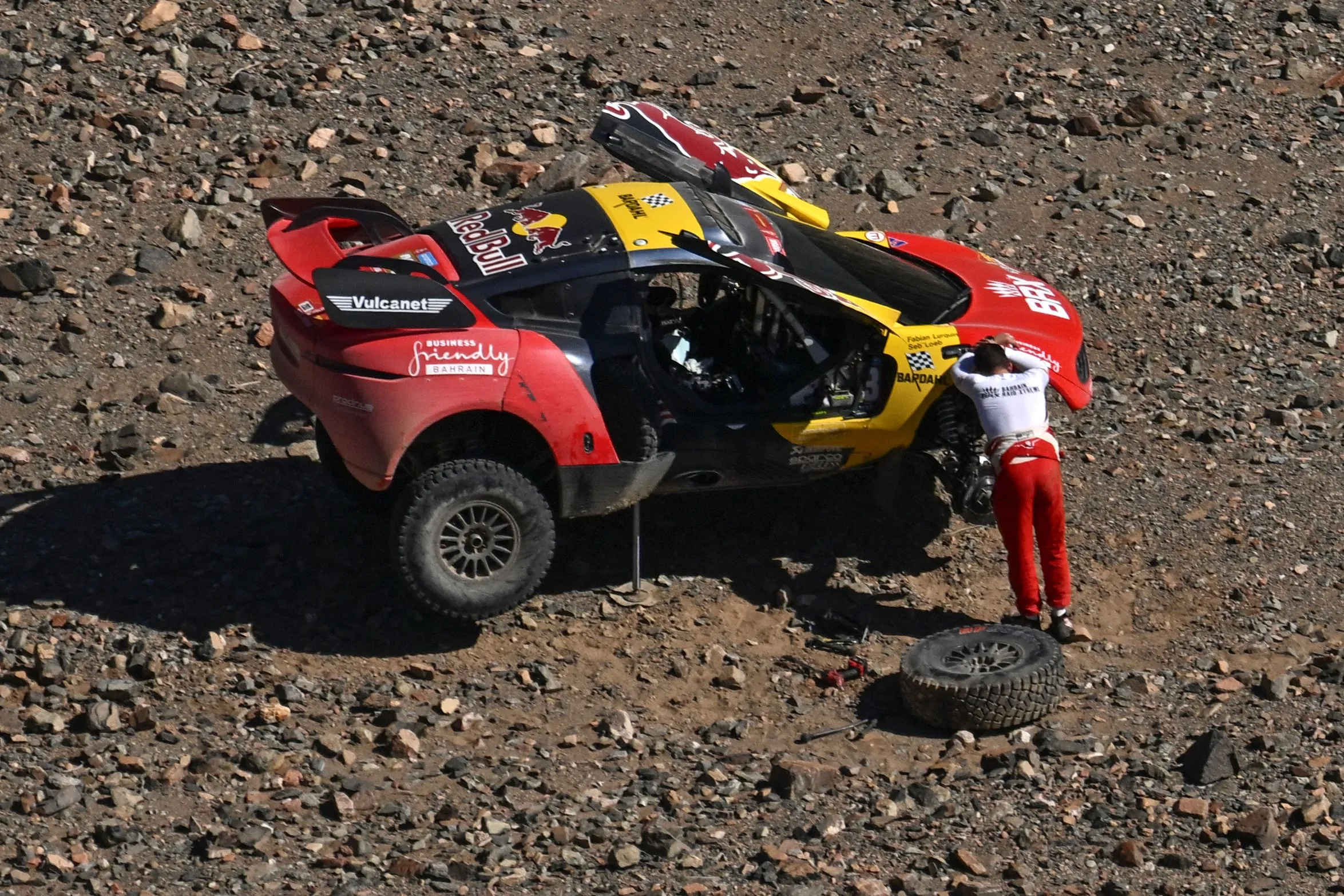 Bahrain Raid Xtreme's Belgian co-driver Fabian Lurquin reacts around the car after mechanical issues during the stage 11 of the 2024 Dakar Rally between Al-Ula and Yanbu, Saudi Arabia, on January 18, 2024. (Photo by Patrick Hertzog/AFP Photo)