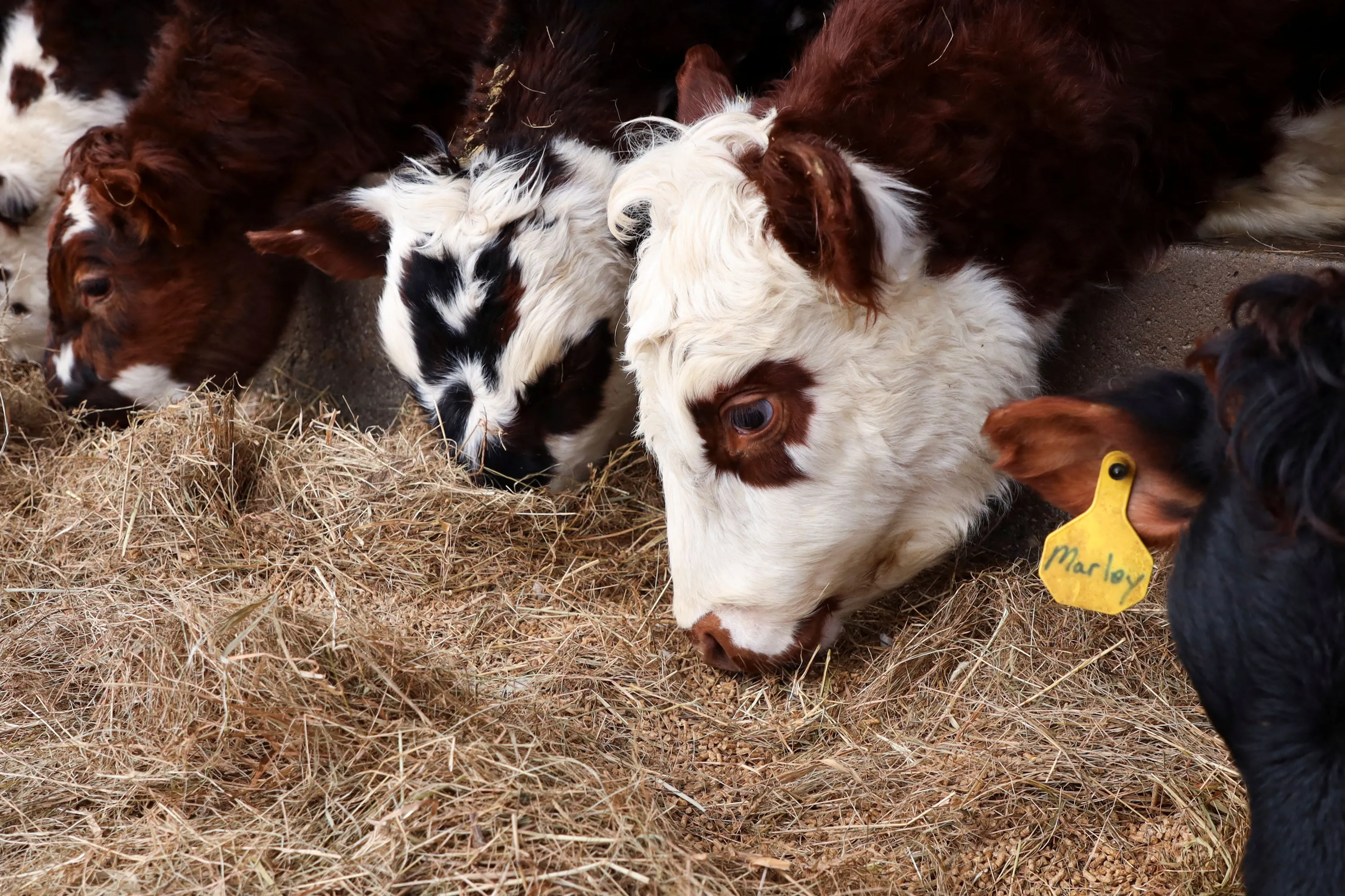 Cattle, ear-tagged with individual names, eat at Robie Farm in Piermont, New Hampshire, U.S. January 21, 2024. (Photo by Maria Alejandra Cardona/Reuters)