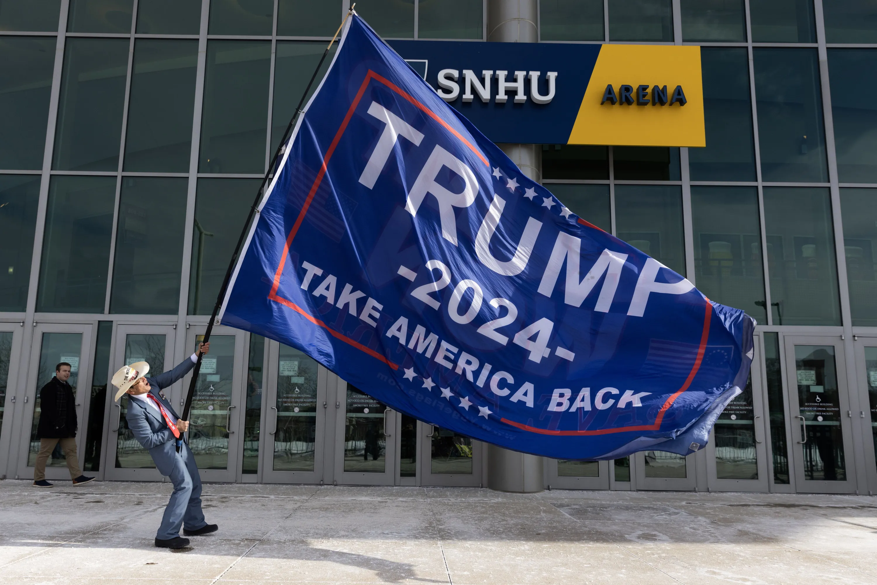 A supporter of former US President Donald J. Trump holds a large flag while waiting in frigid temperatures with other Trump supporters outside SNHU Arena before a Trump campaign rally in Manchester, New Hampshire, USA, 20 January 2024. The New Hampshire primary is held 23 January 2024 and is the second contest in the nominating process of the Republican presidential nomination. (Photo by Michael Reynolds/EPA)