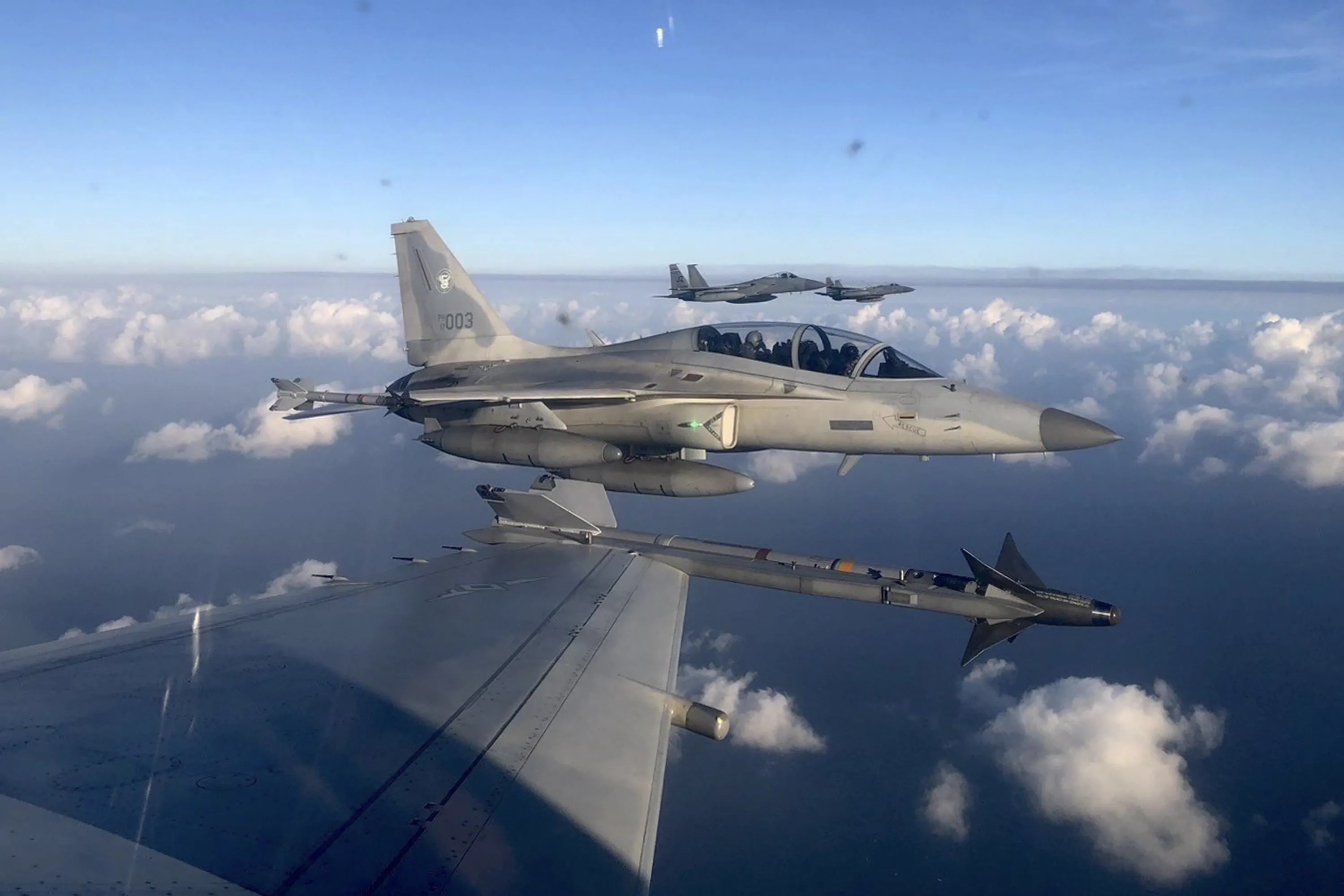 In this handout photo released by the Philippine Air Force, a Philippine Air Force FA-50PH jet fighter, joins the maritime patrol of the Philippines and the United States over Batanes and areas in the West Philippine Sea on Tuesday, November 21, 2023. The United States and Philippines are conducting joint air and maritime patrols in the South China Sea, which come as the two countries step up cooperation in the face of growingly aggressive Chinese activity in the area. (Photo by Philippine Air Force via AP Photo)