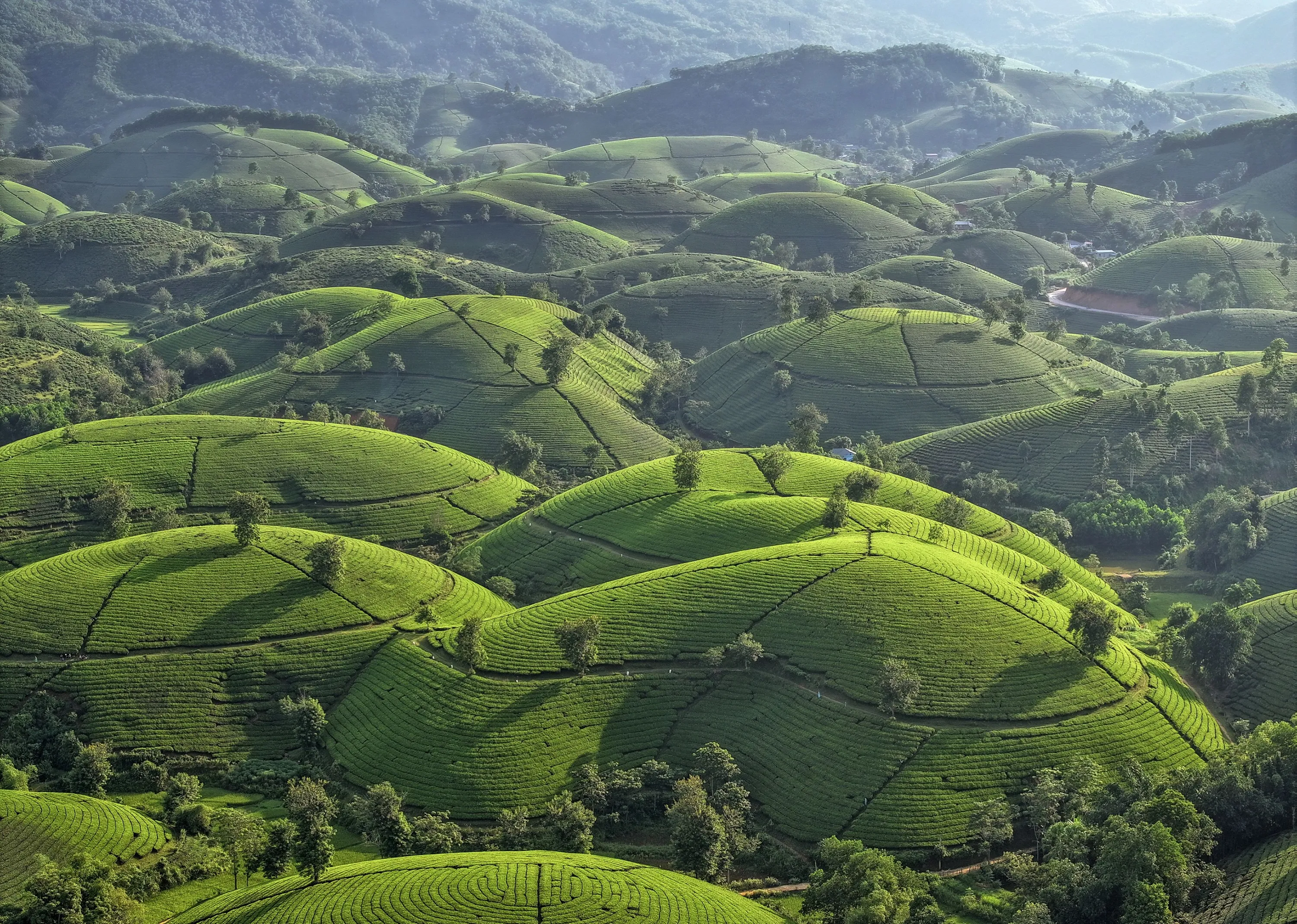 Tea plantations on hills facing each other create a kaleidoscope of curves and angles in the second decade of December 2023. The Long Coc Tea Hills are located in Phu Tho Province. The workers all wear traditional dress, which creates a beautiful connection to the rich history of the Muong people. Once the leaves are harvested they are dried and sold for approximately 25p per kilogram. (Photo by Sarawut Intarob/Solent News & Photo Agency)