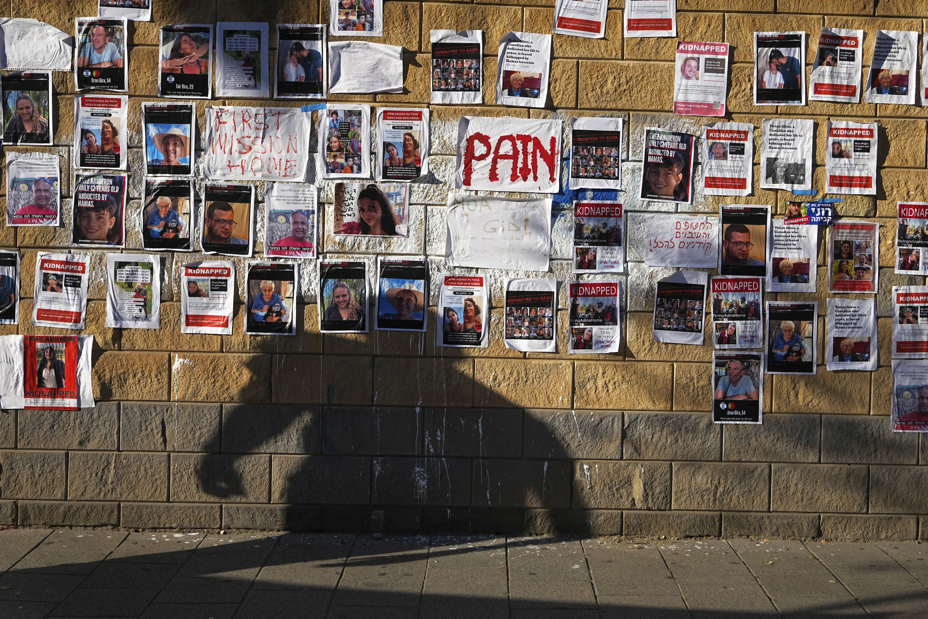 Photos of Israelis missing and held captive in Gaza, are displayed on a wall in Tel Aviv, Israel, Wednesday, October 18, 2023. The Israeli army says some 200 people were kidnapped and taken to Gaza in Hamas' cross-border attack on Israel on Oct. 7. (Photo by Ohad Zwigenberg/AP Photo)