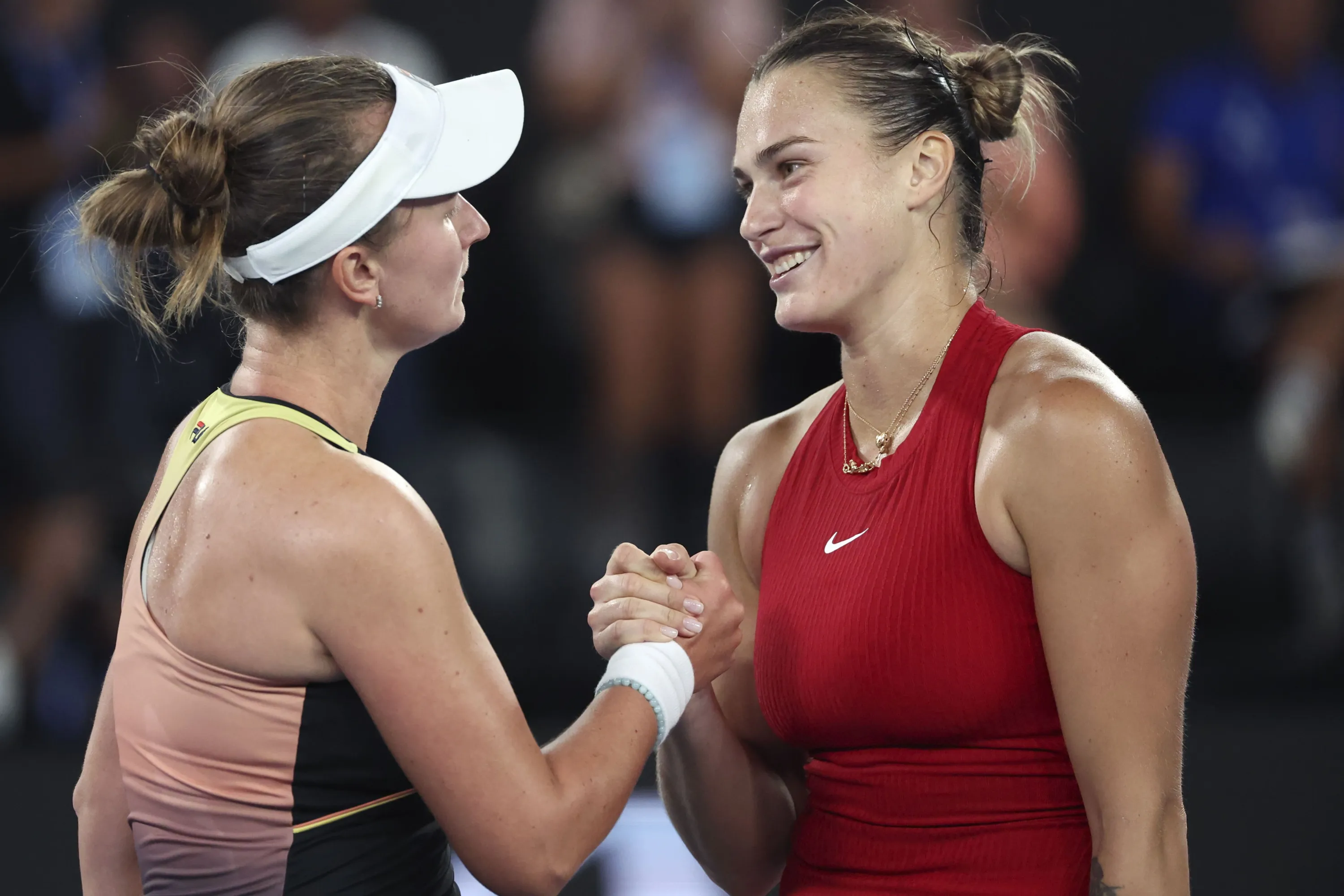 Aryna Sabalenka, right, of Belarus is congratulated by Barbora Krejcikova of the Czech Republic following their quarterfinal match at the Australian Open tennis championships at Melbourne Park, Melbourne, Australia, Tuesday, January 23, 2024. (Photo by Asanka Brendon Ratnayake/AP Photo)