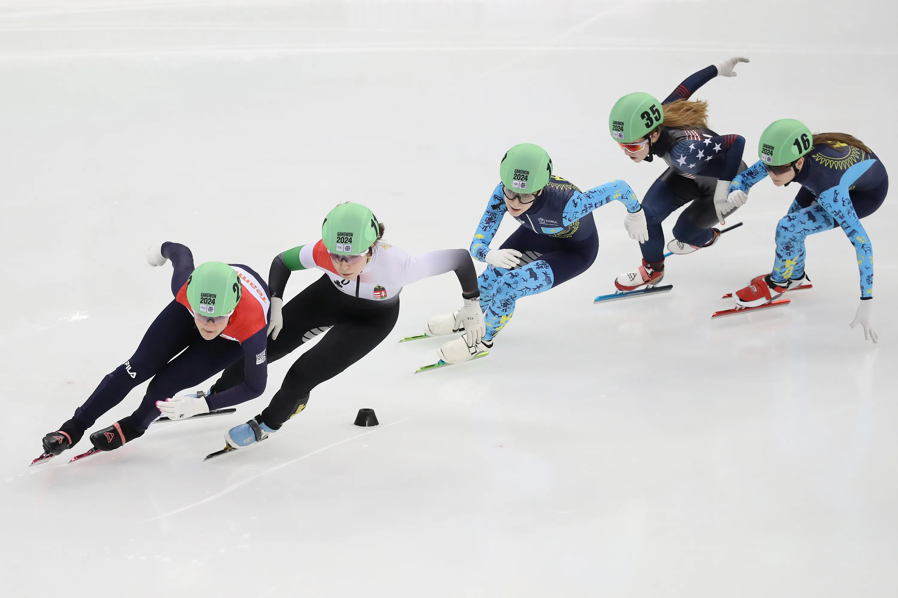 Angel Daleman of the Netherlands, Diana Laura Vegi of Hungary, Eliza Rhodehamel of the United States, Polina Omelchuk of Kazakhstan and Anastassiya Astrakhantseva of Kazakhstan compete in the Women 500m Quarterfinals during a day three of the Winter Youth Olympic Games at Gangneung Ice Arena on January 22, 2024 in Gangneung, South Korea. (Photo by Chung Sung-Jun/Getty Images)