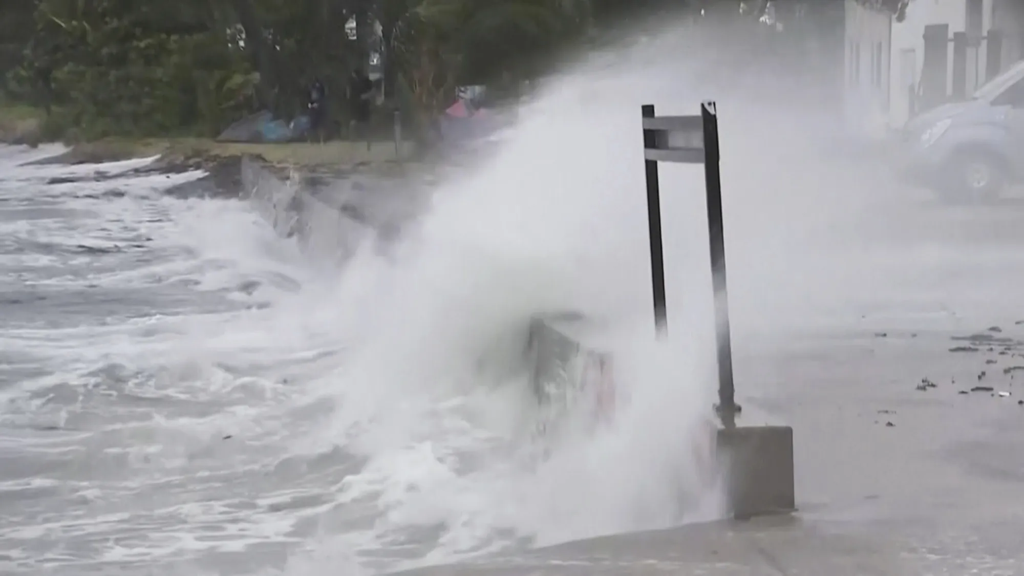 In this image made from video provided by AubC, waves hit a coastline in Bowen, Australia, Thursday, January 25, 2024. Strong winds hit Australia’s northeast coast Friday, leaving thousands without power, but the area was spared heavy damage as Tropical Cyclone Kirrily weakened into a tropical storm. (Photo by AuBC via AP Photo)