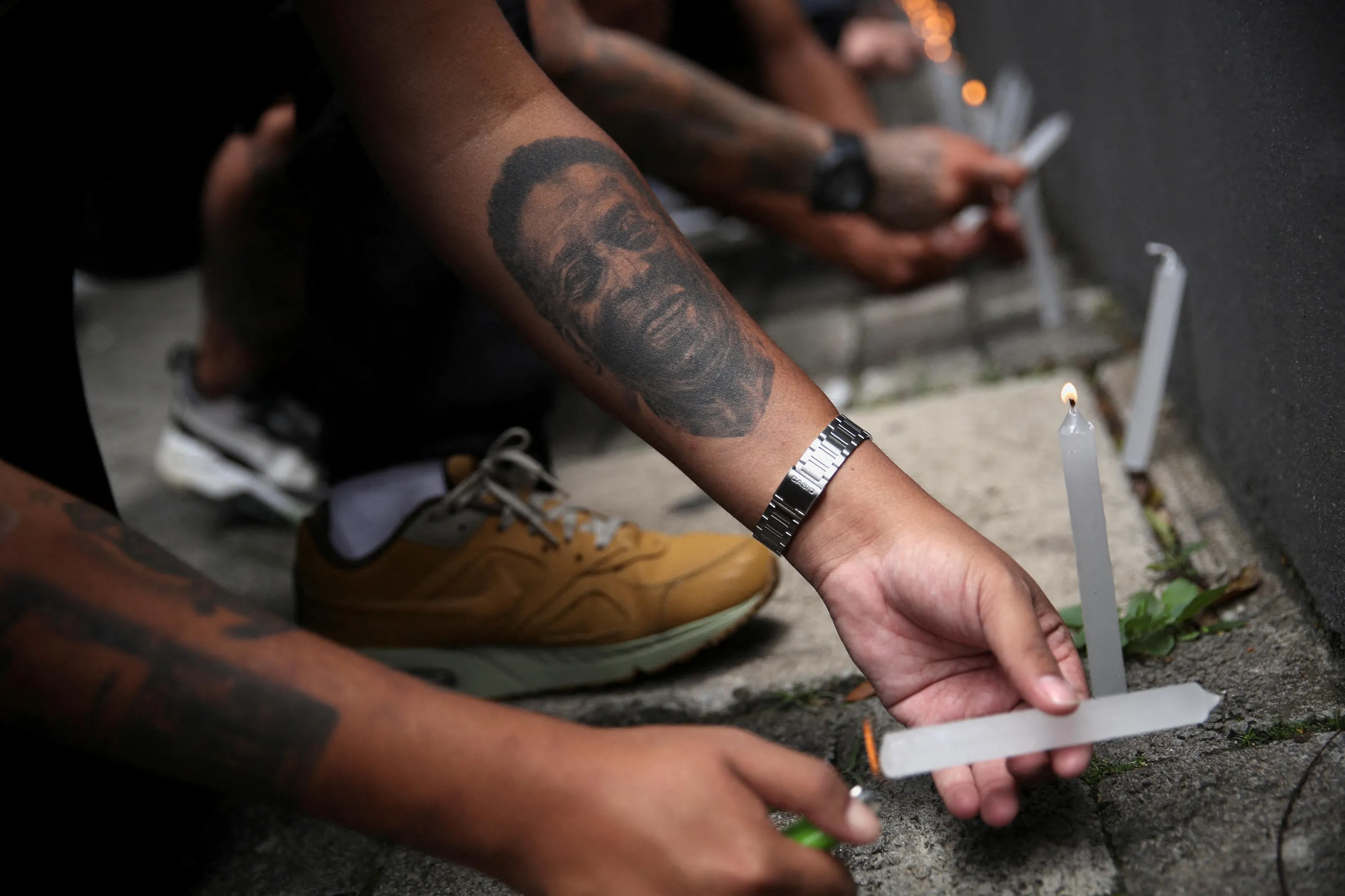 A fan with a tattoo depicting Brazilian football legend Pele places a candle during a vigil in front of the Albert Einstein Hospital where he is hospitalized in Sao Paulo, Brazil on December 4, 2022. (Photo by Carla Carniel/Reuters)