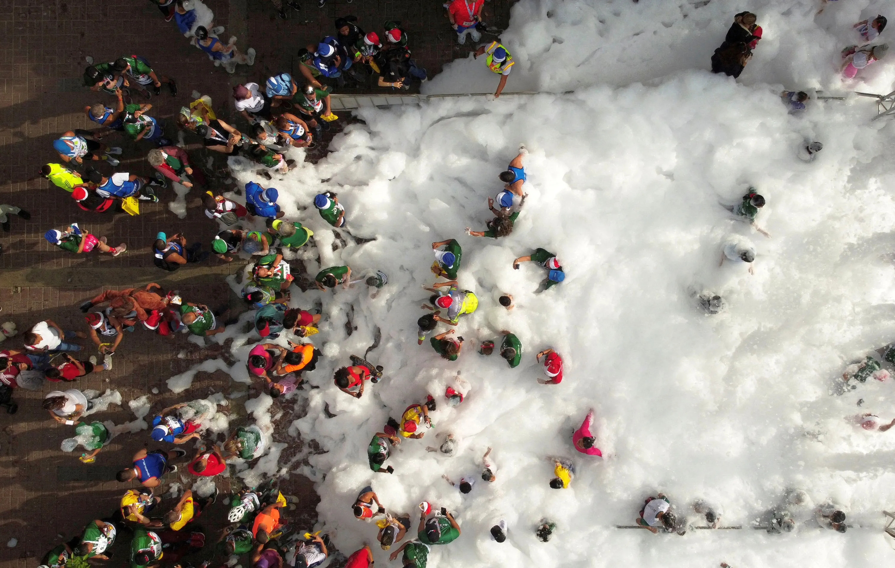 Runners wearing Christmas hats play in the foam at the end of the finish line, after the Santa Run 10-kilometre race, in Caracas, Venezuela on December 17, 2023. (Photo by Leonardo Fernandez Viloria/Reuters)