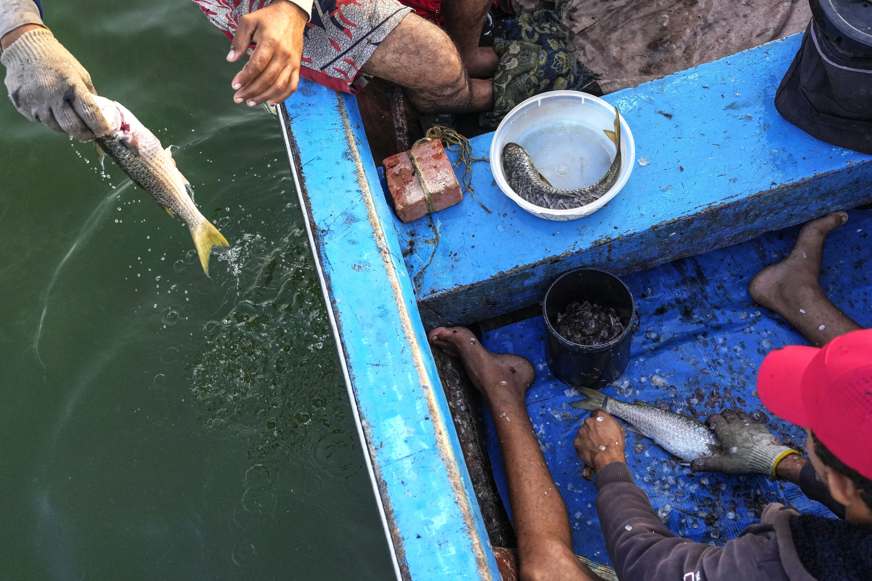 Fishermen rinse and clean their catch on Lake Maracaibo, near La Salina crude oil shipping terminal in Cabimas, Venezuela, December 28, 2023. (Photo by Matias Delacroix/AP Photo)