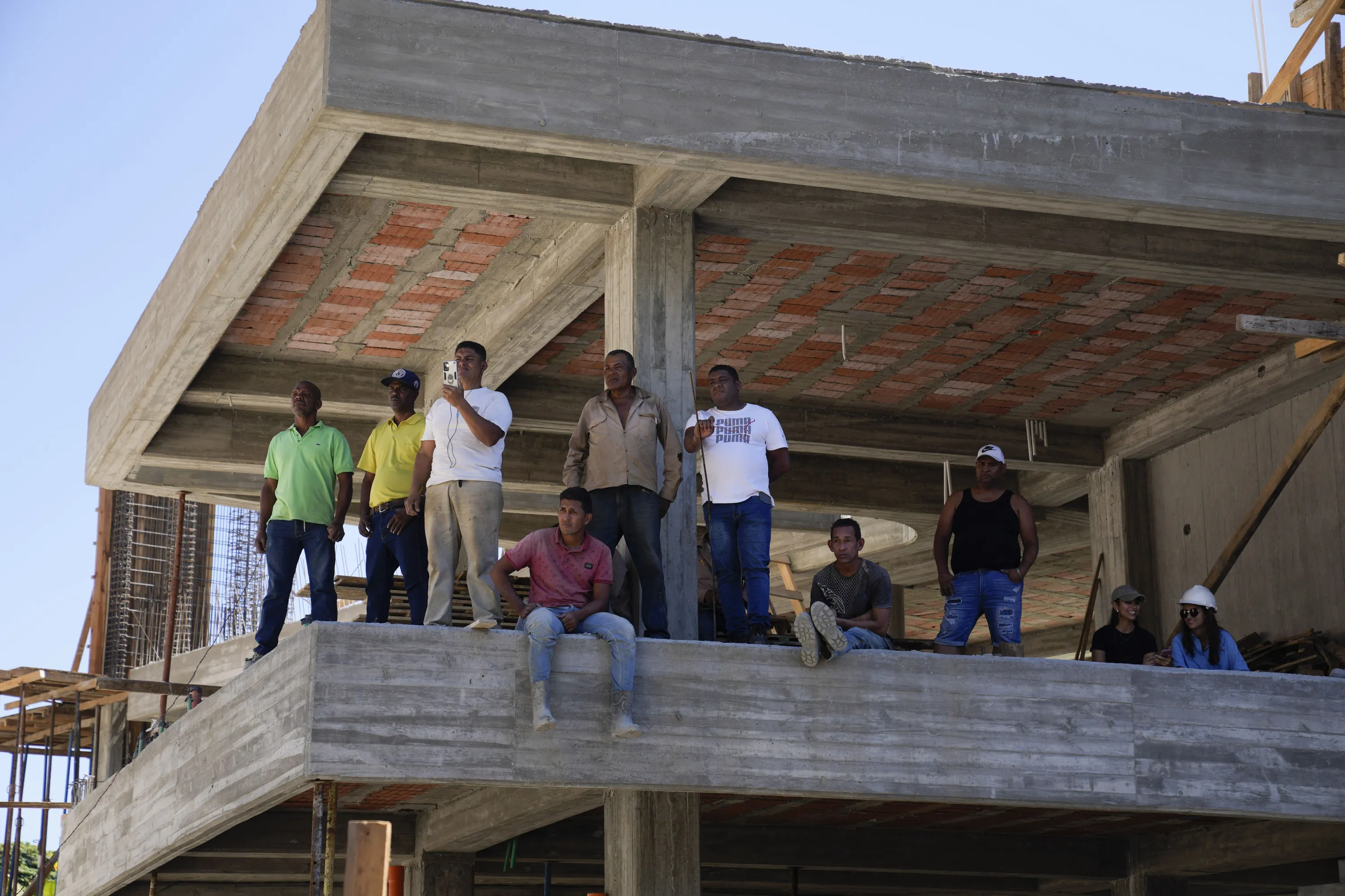 Construction workers pause during a press conference by opposition coalition presidential hopeful Maria Corina Machado held in the street below them, outside her campaign headquarters in Caracas, Venezuela, Monday, January 29, 2024, days after the country's highest court upheld a ban on her candidacy. (Photo by Ariana Cubillos/AP Photo)