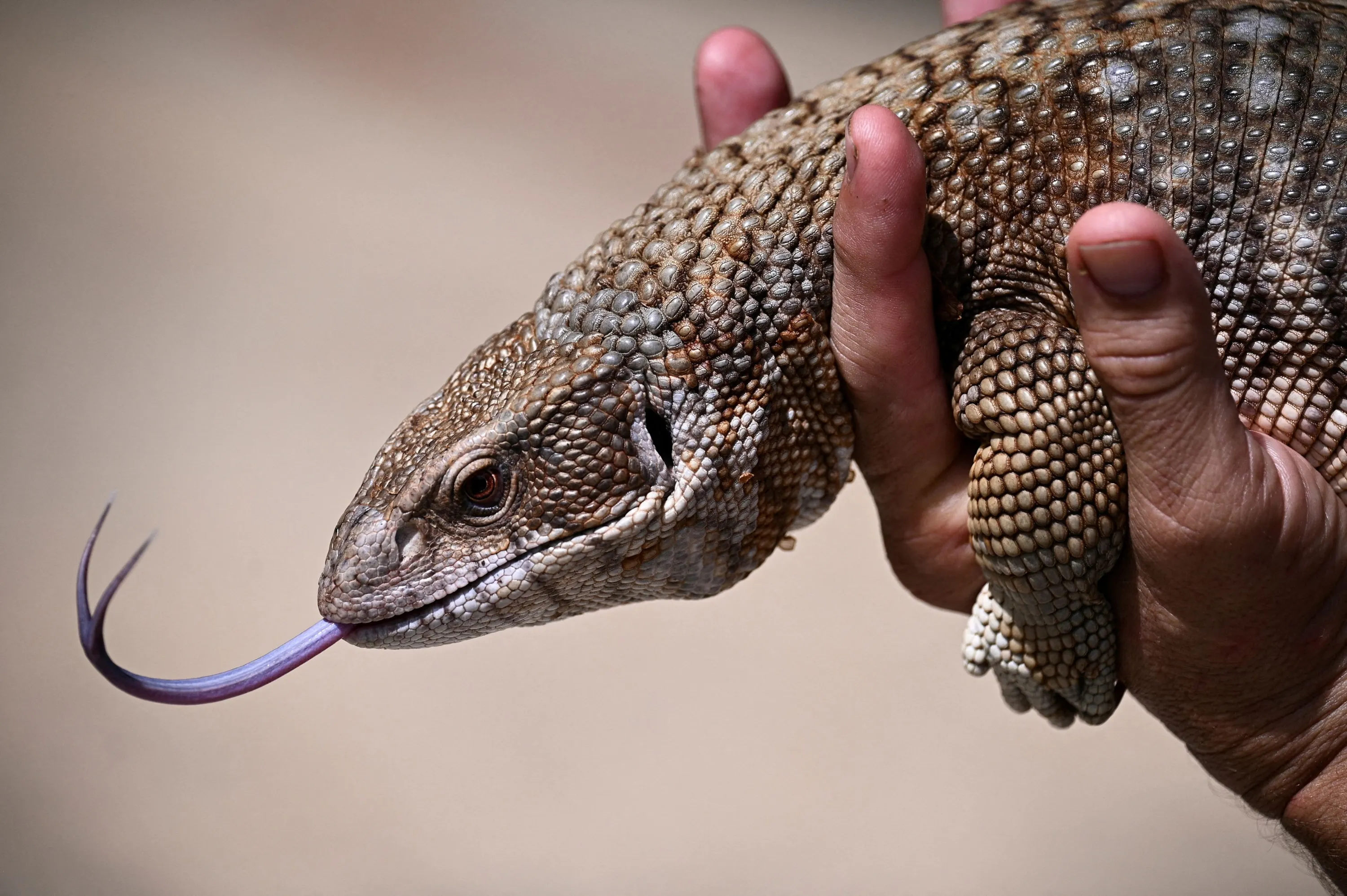 A man holds a Savannah monitor in the petting zoo “La Casita del Avestruz” (The ostrich's little house), in Caracas, Venezuela on January 28, 2024. (Photo by Gaby Oraa/Reuters)