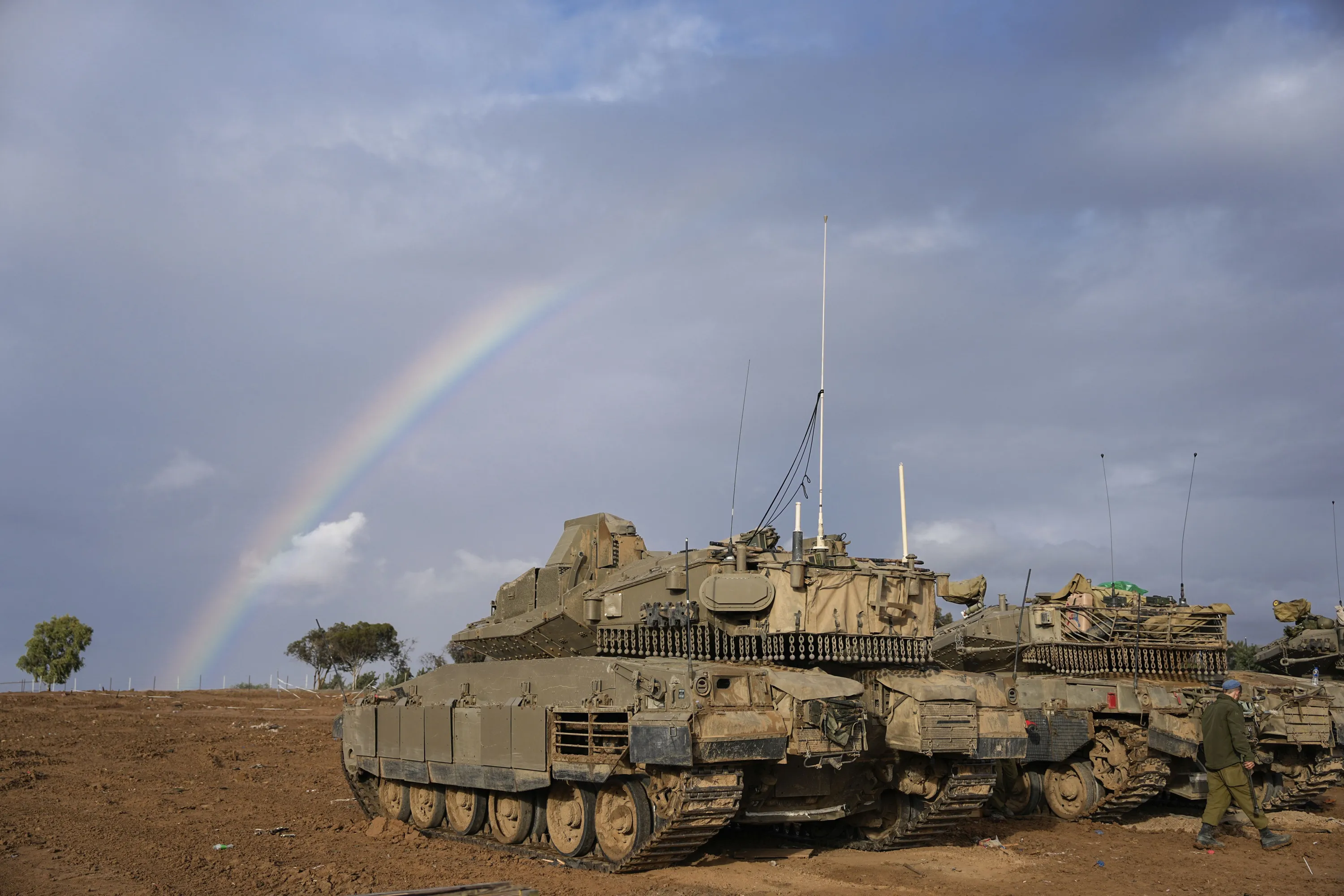 Israeli tanks are parked at an army staging area near Israel's border with Gaza, southern Israel, Monday, November 27, 2023. on the fourth day of a temporary cease-fire between Israel and Hamas. (Photo by Ohad Zwigenberg/AP Photo)