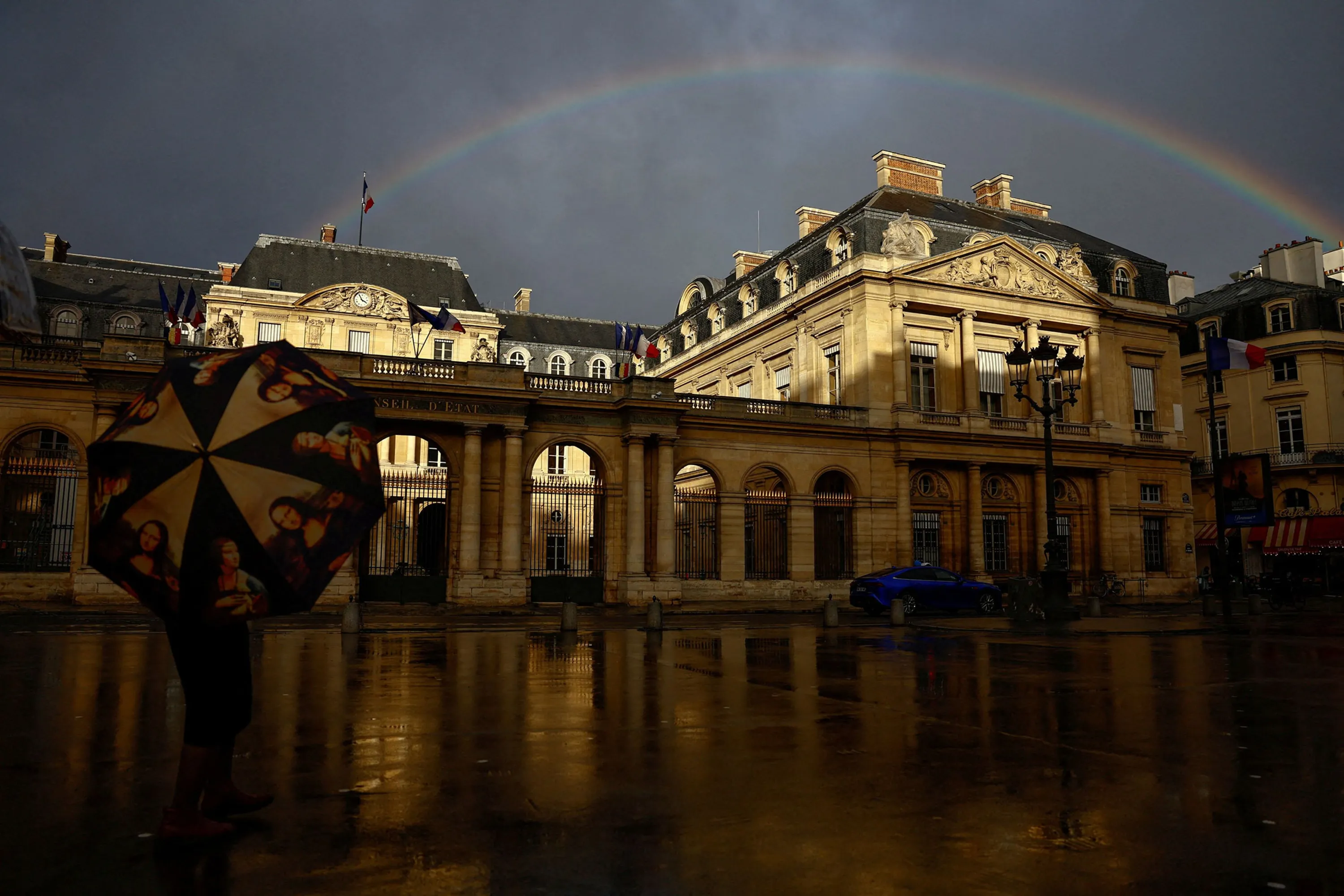 A woman holds an umbrella depicting the Mona Lisa by Leonardo Da Vinci as she looks a the rainbow near the Conseil d'Etat, France's highest administrative court in Paris, France on November 10, 2023. (Photo by Gonzalo Fuentes/Reuters)