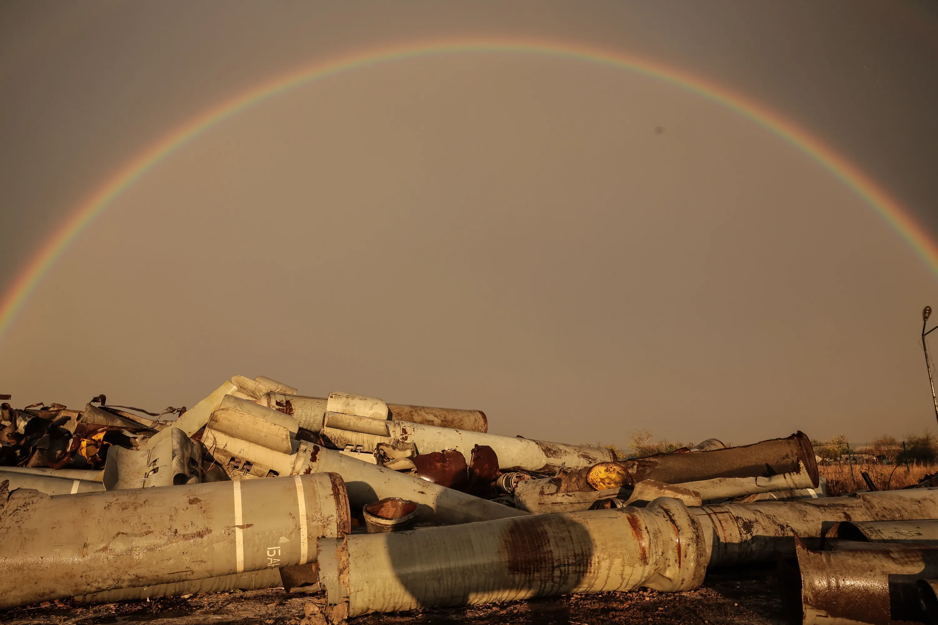 A rainbow above the debris of spent missiles in the village of Posad-Pokrovske in the Kherson region, 01 November 2023. Russia bombarded 118 Ukrainian towns and villages in 24 hours, more than on any other day this year, Ukrainian Interior Minister Ihor Klymenko announced 02 November 2023. Russian troops entered Ukrainian territory in February 2022, starting a conflict that has provoked destruction and a humanitarian crisis. (Photo by Oleg Petrasyuk/EPA/EFE)