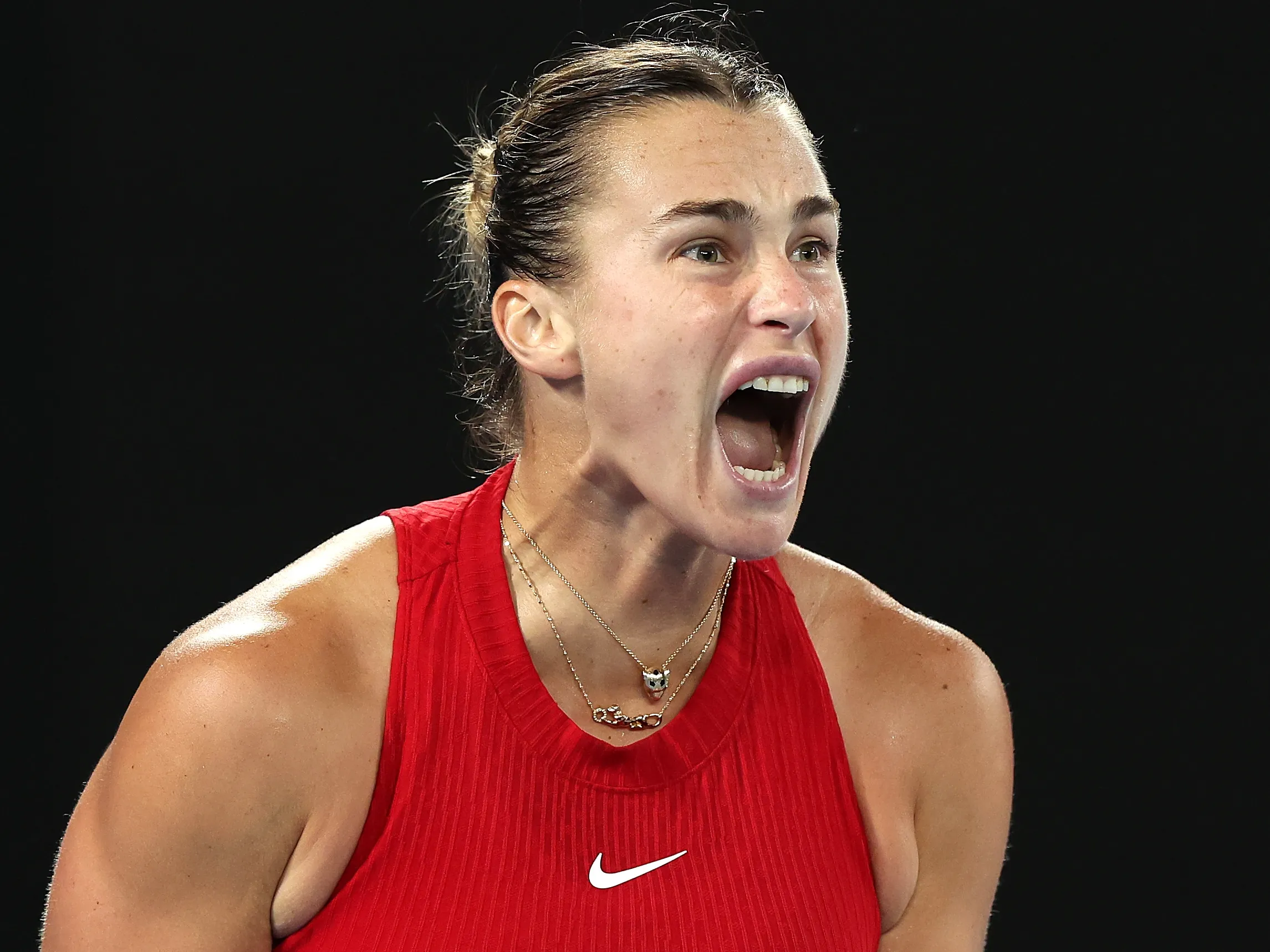 Belarus' Aryna Sabalenka reacts on a point against USA's Coco Gauff during their women's singles semi-final match on day 12 of the Australian Open tennis tournament in Melbourne on January 25, 2024. (Photo by Martin Keep/AFP Photo)