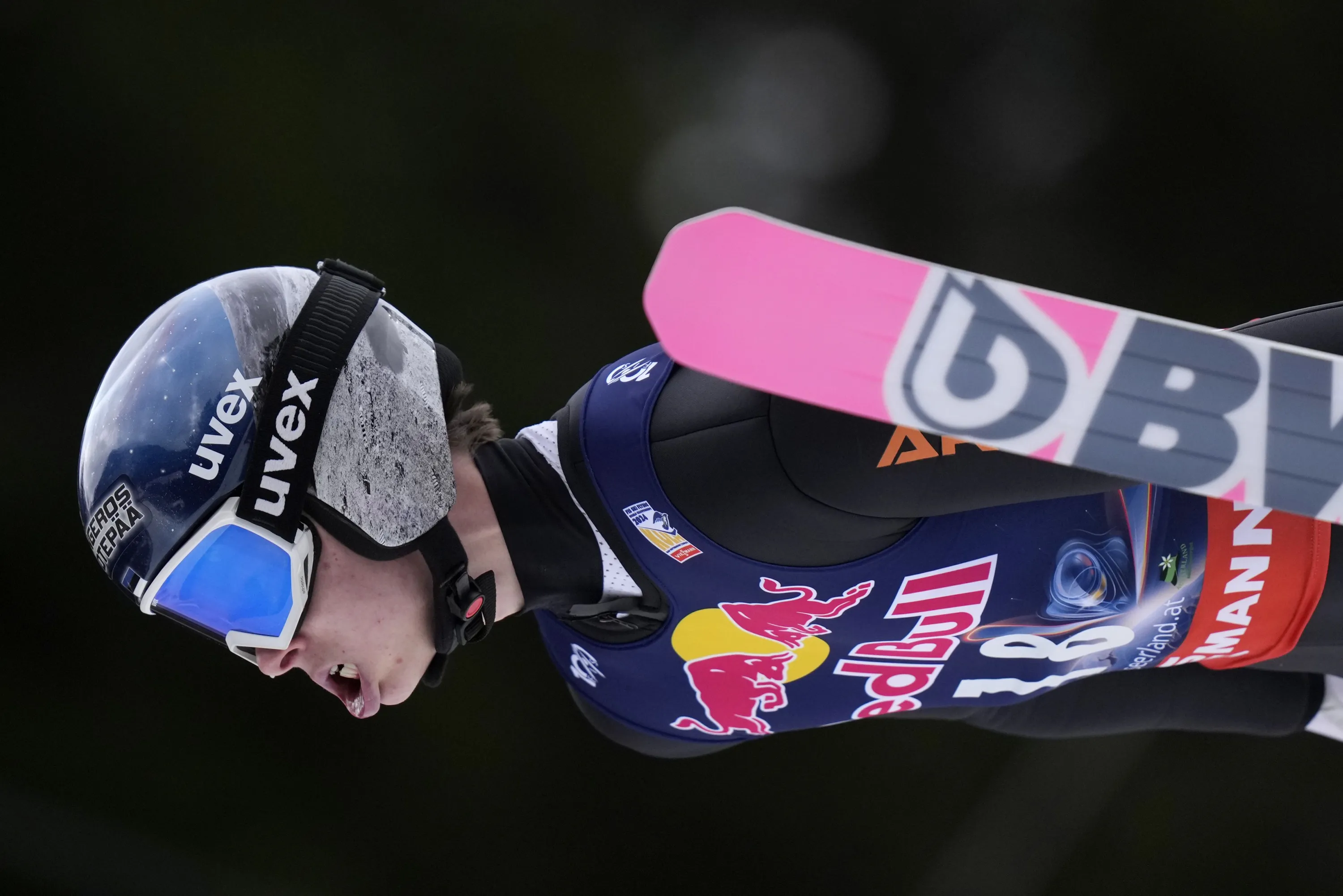 Artti Aigro, of Estonia, soars through the air during his first round jump of the ski flying world championships, at the Kulmkogel mountain in Bad Mitterndorf, Austria, Friday, January 26, 2024. (Photo by Matthias Schrader/AP Photo)