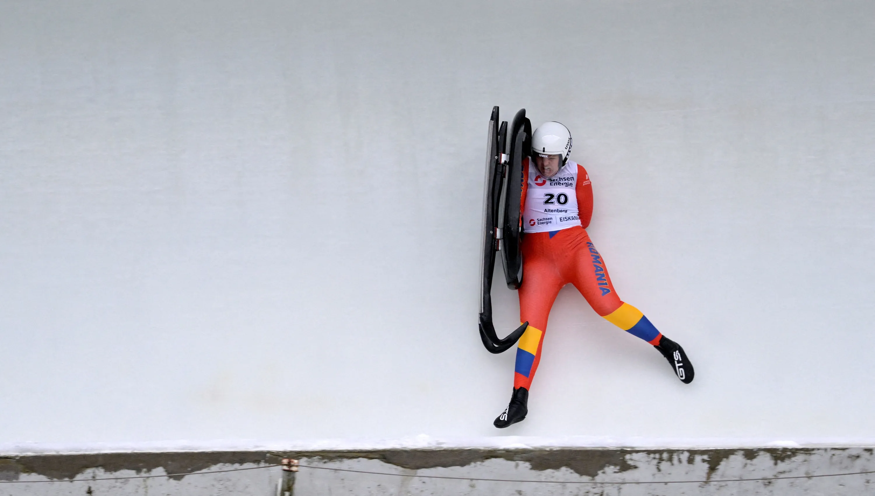 Romania's Iona-Corina Buzatoiu crashes during qualification in the luge at the World Championships in Altenberg, Germany on January 26, 2024. (Photo by Matthias Rietschel/Reuters)