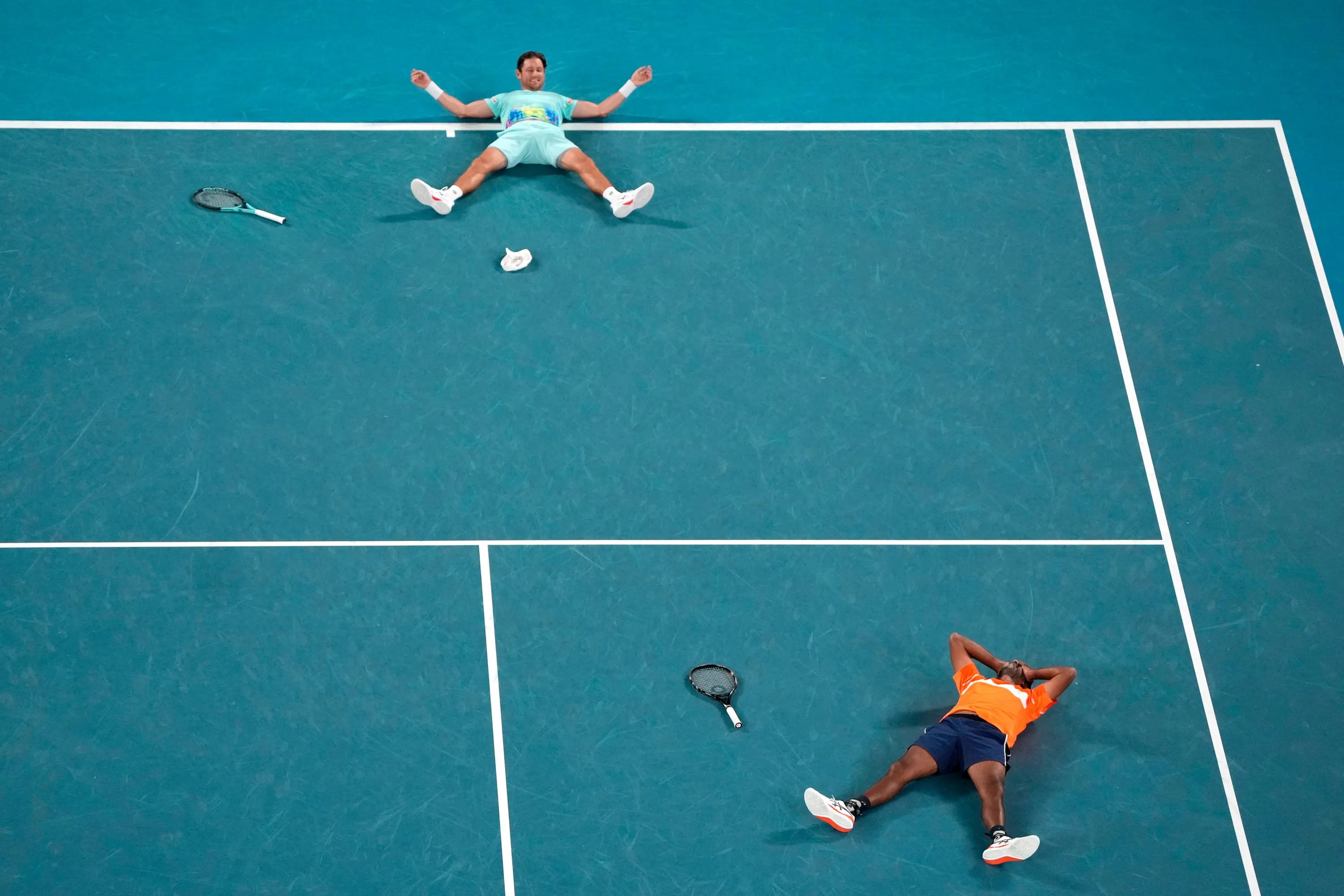 Rohan Bopanna of India and Matthew Ebden, top, of Australia celebrate after defeating Simone Bolelli and Andrea Vavassori of Italy in the men's doubles final the Australian Open tennis championships at Melbourne Park, Melbourne, Australia, Saturday, January 27, 2024. (Photo by Louise Delmotte/AP Photo)