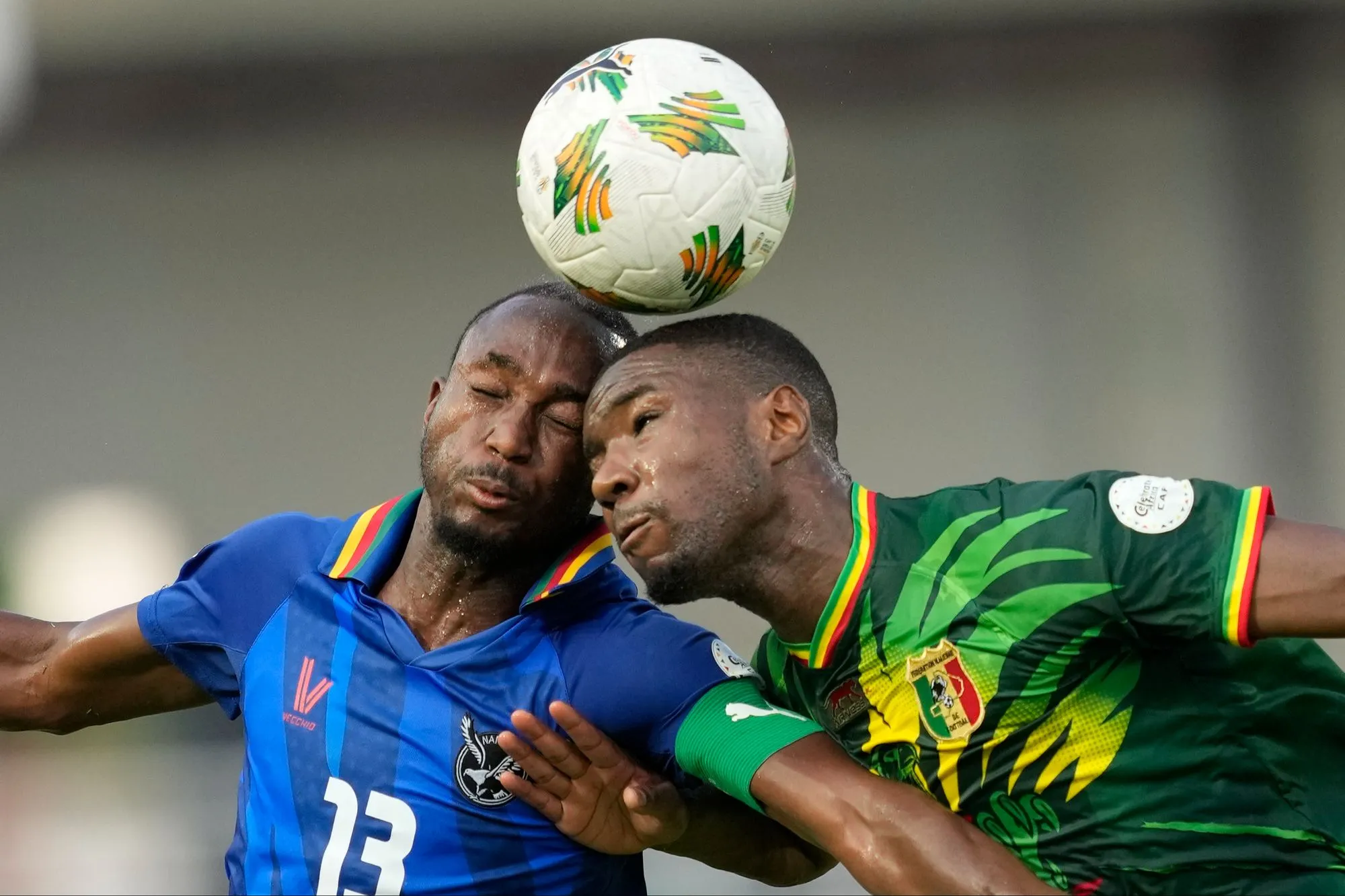 Namibia's Peter Shalulile, left, goes for the header with Mali's Moussa Diarra, during the African Cup of Nations Group E soccer match between Namibia and Mali, at the Laurent Pokou Stadium in San Pedro, Ivory Coast, Wednesday, January 24, 2024. (Photo by Sunday Alamba/AP Photo)