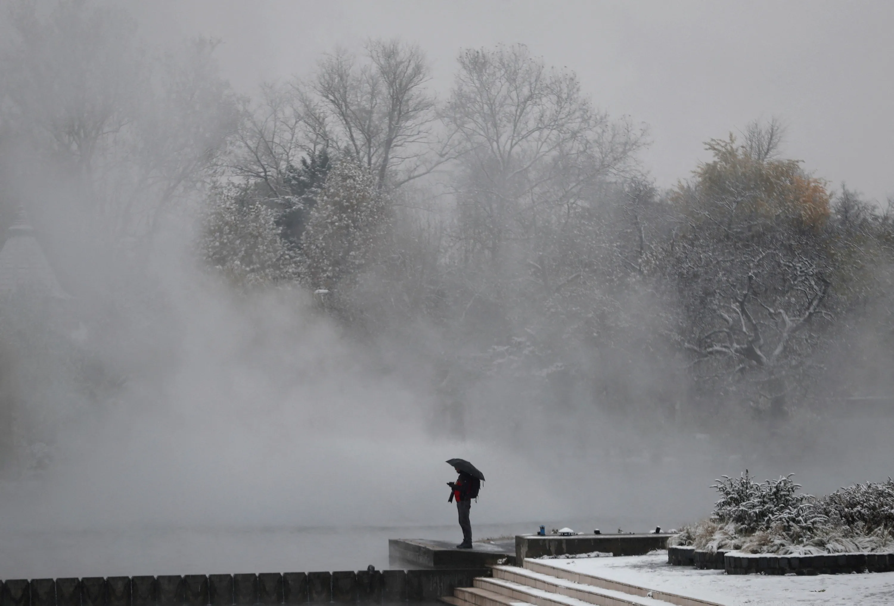 A man stands at the snow-covered City Park during the first snowfall in Budapest, Hungary on November 30, 2023. (Photo by Bernadett Szabo/Reuters)