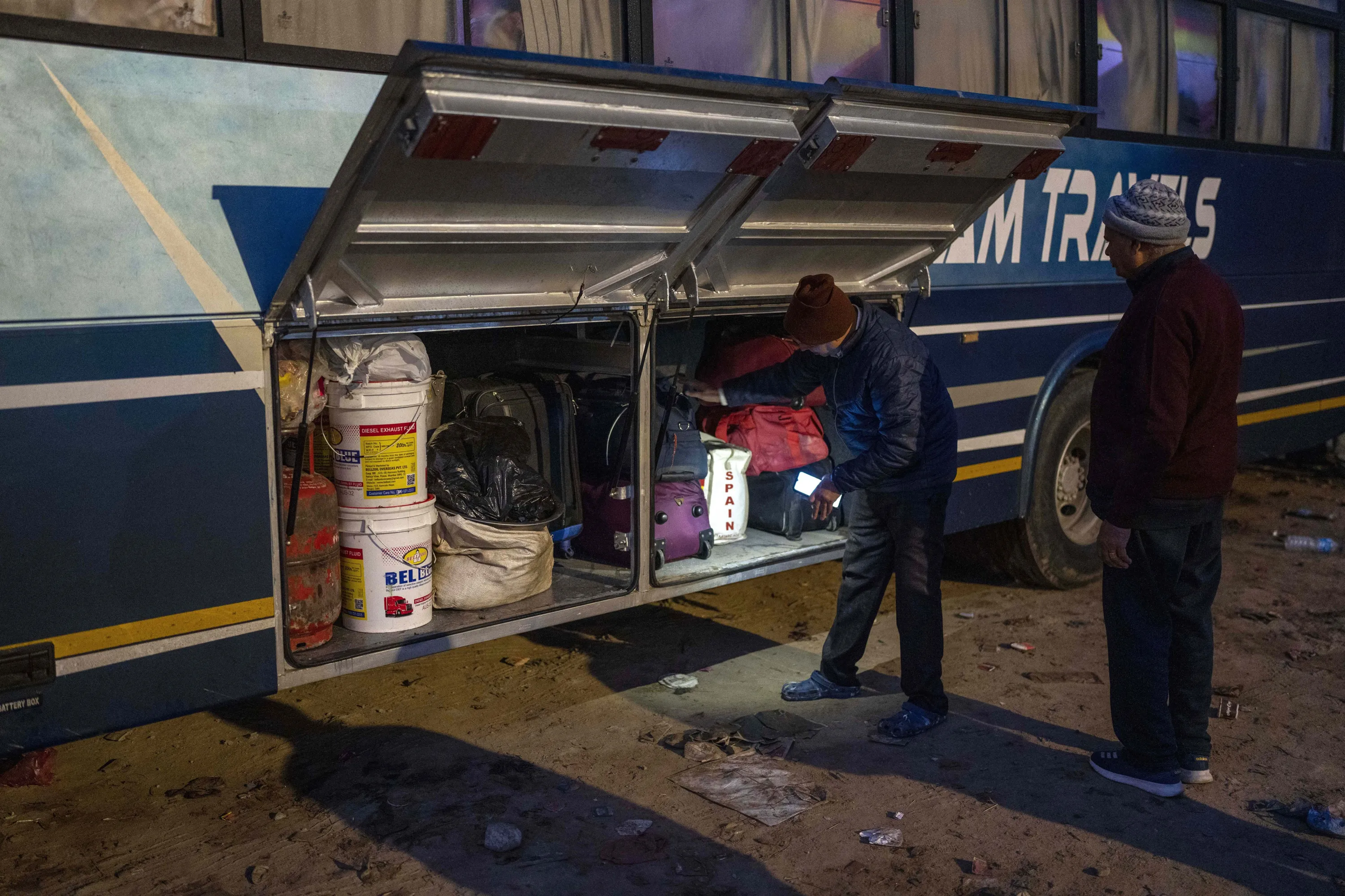 An Indian pilgrim loads baggage as they get ready for their departure after visiting Pashupatinath temple in Kathmandu, Nepal, January 12, 2024. (Photo by Niranjan Shrestha/AP Photo)