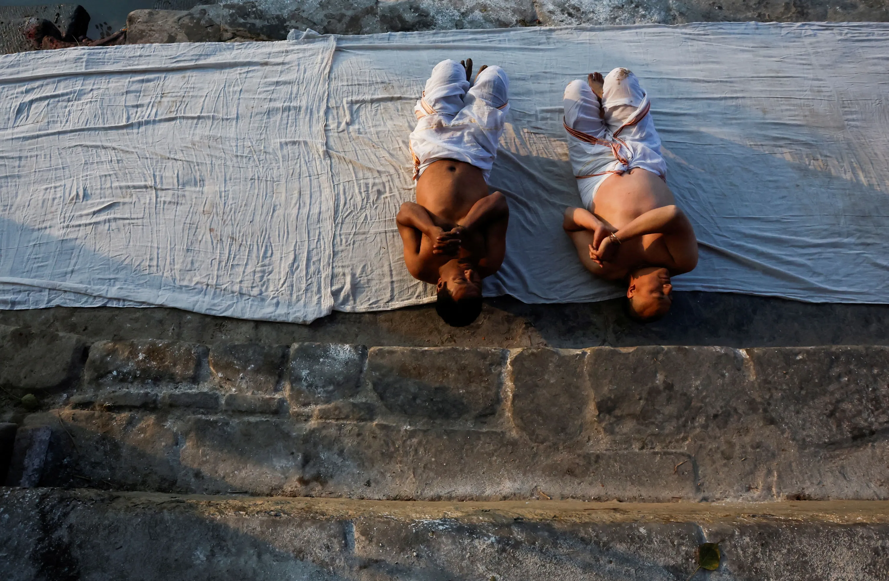 Devotees offer prayer by rolling on the ground during the month-long Swasthani Brata Katha festival at the bank of Hanumante river in Bhaktapur, Nepal on January 29, 2024. (Photo by Navesh Chitrakar/Reuters)