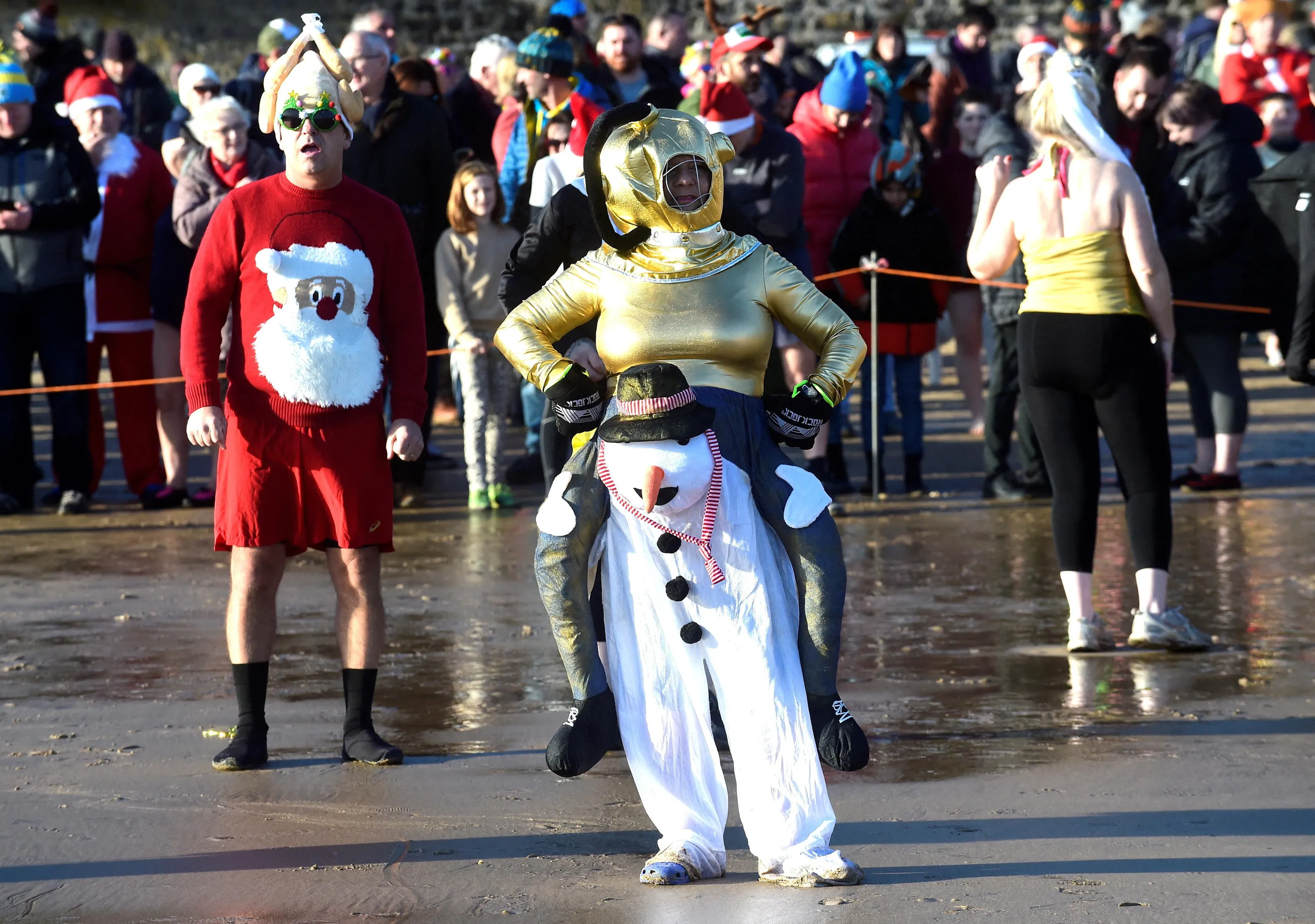Participants wait for the start of the 50th Boxing Day sea swim at Tenby, Wales, Britain on December 26, 2022. (Photo by Rebecca Naden/Reuters)