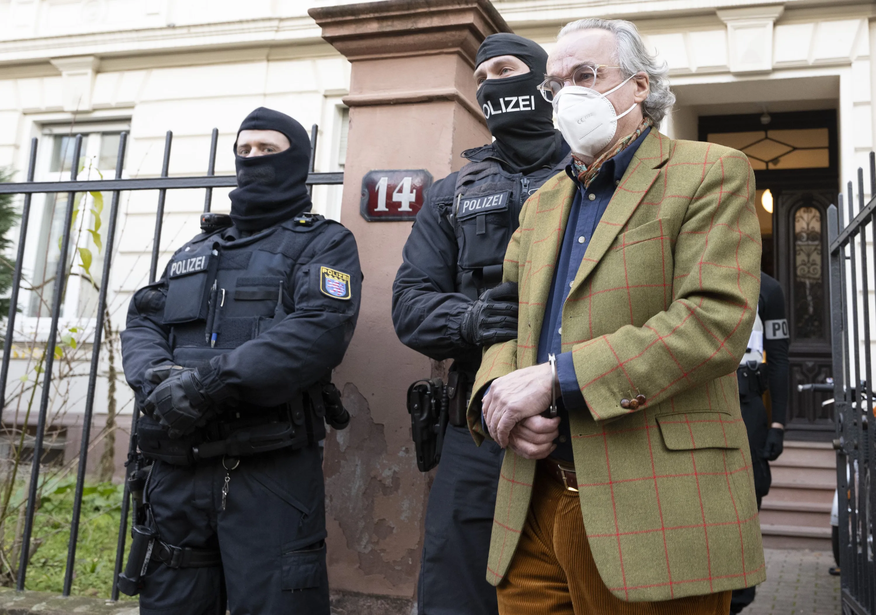 Masked police officers lead Heinrich XIII Prince Reuss, right, to a police vehicle during a raid against so-called “Reich citizens” in Frankfurt, Germany, Wednesday, December 7, 2022. Thousands of police carried out a series of raids across much of Germany on Wednesday against suspected far-right extremists who allegedly sought to overthrow the state by force. Federal prosecutors said some 3,000 officers conducted searches at 130 sites in 11 of Germany's 16 states against adherents of the so-called Reich Citizens movement. Some members of the grouping reject Germany's postwar constitution and have called for the overthrow of the government. (Photo by Boris Roessler/dpa via AP Photo)