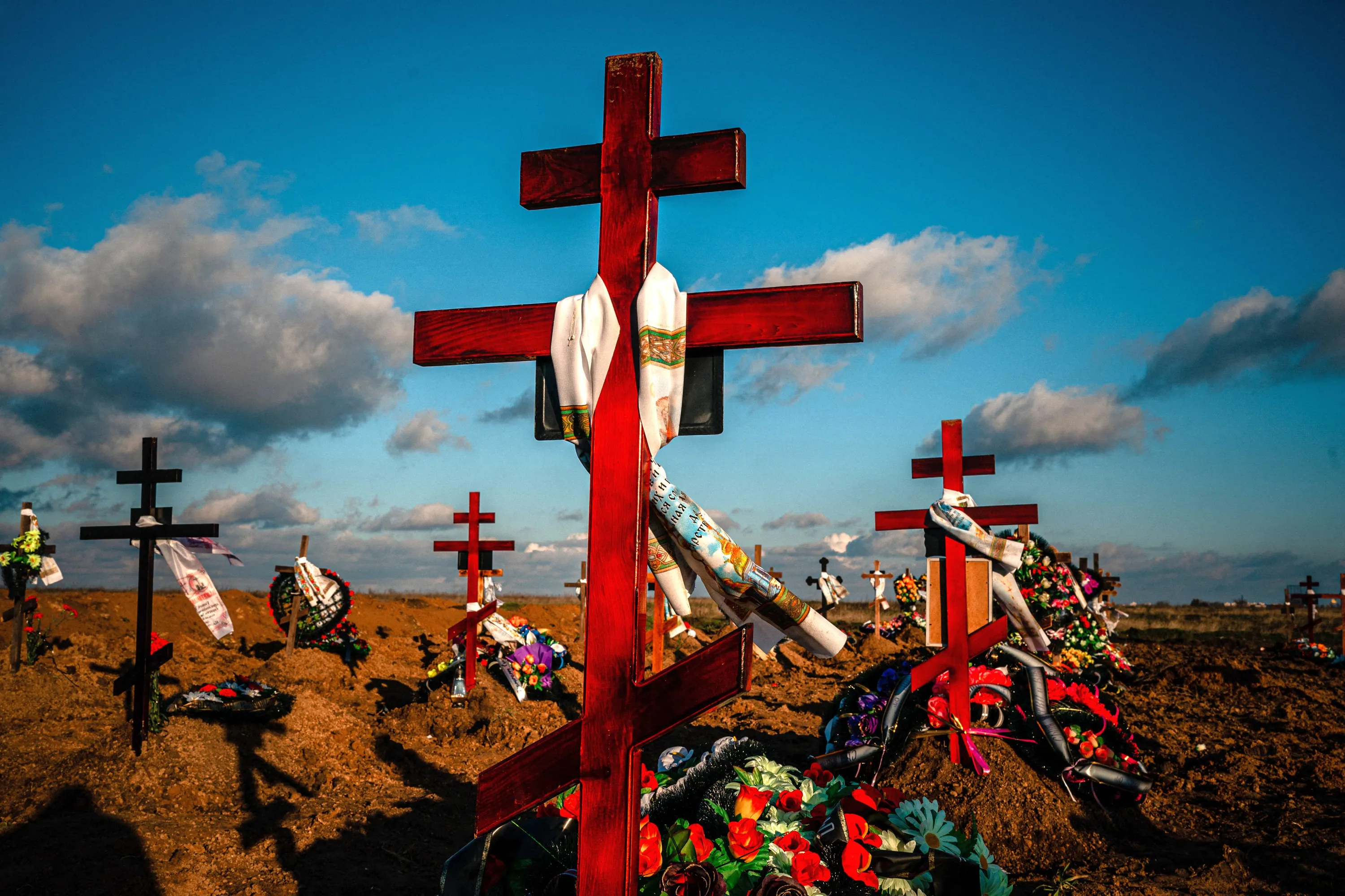 Memprial crosses are seen on the new graves at a cemetery in the southern city of Kherson on December 28, 2022. (Photo by Dimitar Dilkoff/AFP Photo)