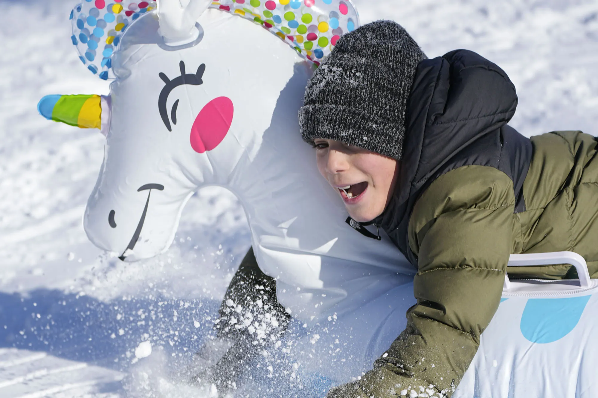 Otis Vanhook smiles as he rides an inflated unicorn down a hill, Tuesday, January 16, 2024, in Nashville, Tenn. A snowstorm blanketed the area with up to eight inches of snow and frigid temperatures. (Photo by George Walker IV/AP Photo)