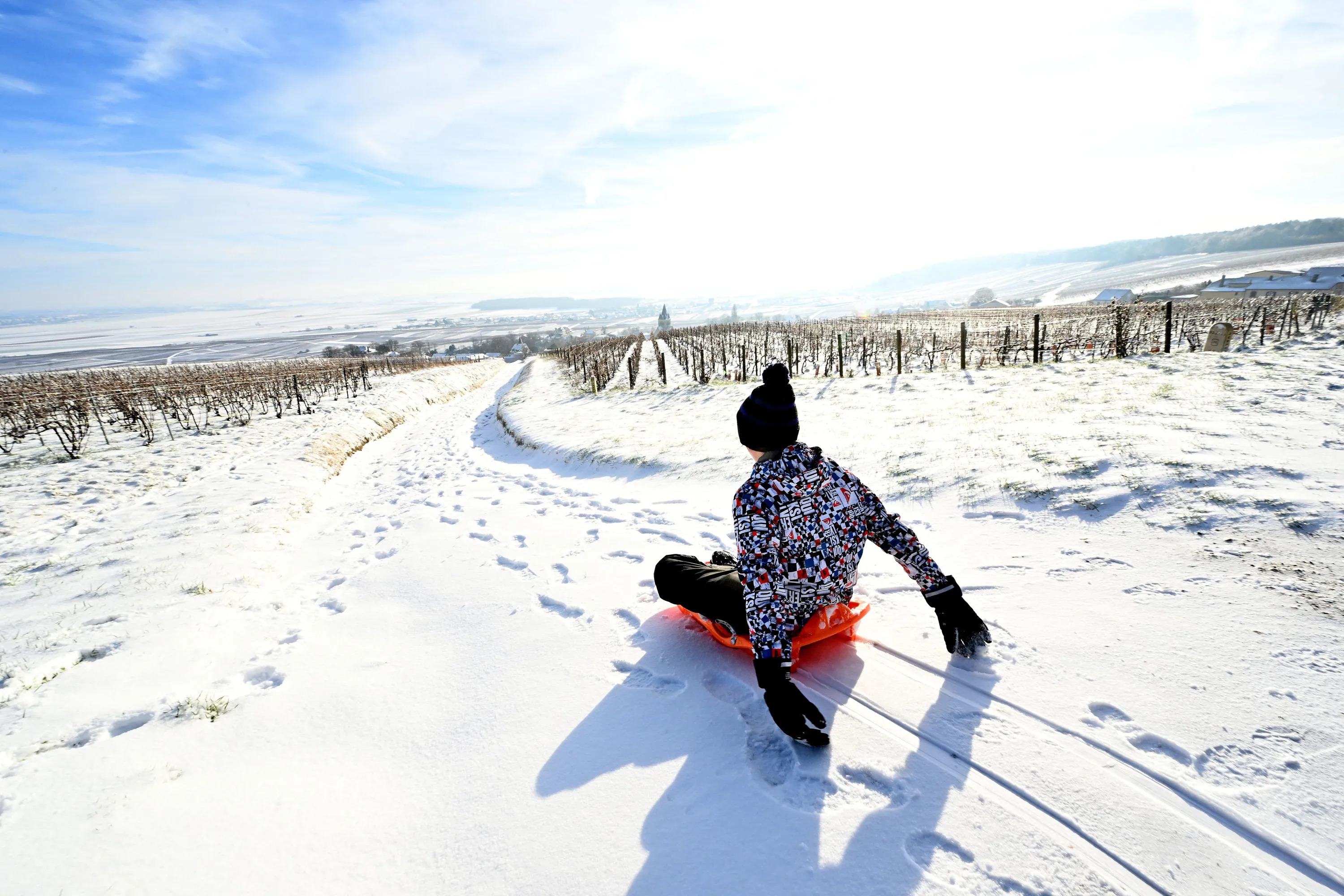 A child rides a sled as snow blankets a vinyard in Ville-Dommange, southwest of Reims in the Champagne region, on January 18, 2024. (Photo by François Nascimbeni/AFP Photo)