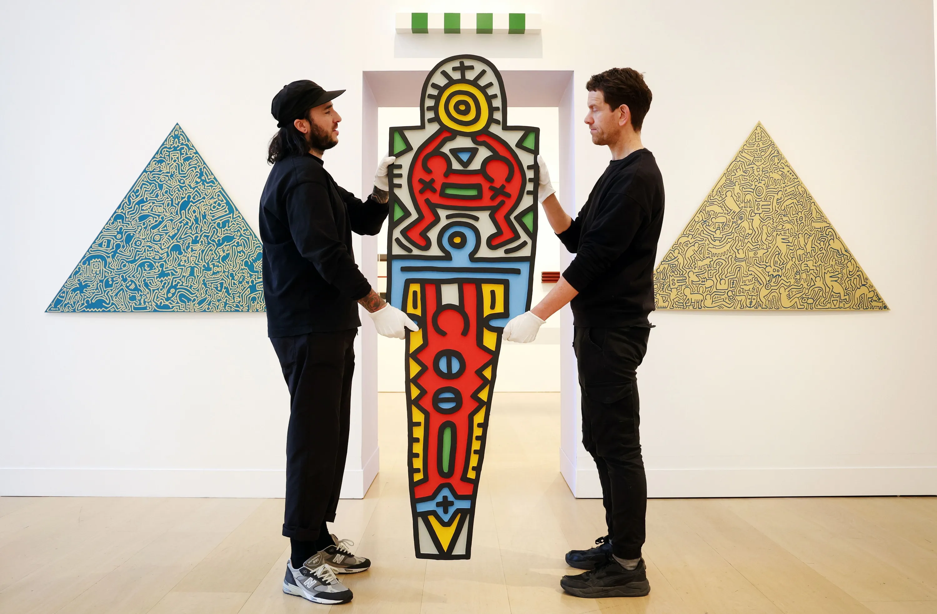 Phillips auction house staff members carry an artwork by Keith Haring titled “Totem” (1988) during the Philips Editions exhibition in London, Britain, 11 January 2024. The artwork is expected to fetch between 150,000 - 200,000 euros at auction 17-18 January. (Photo by Andy Rain/EPA)