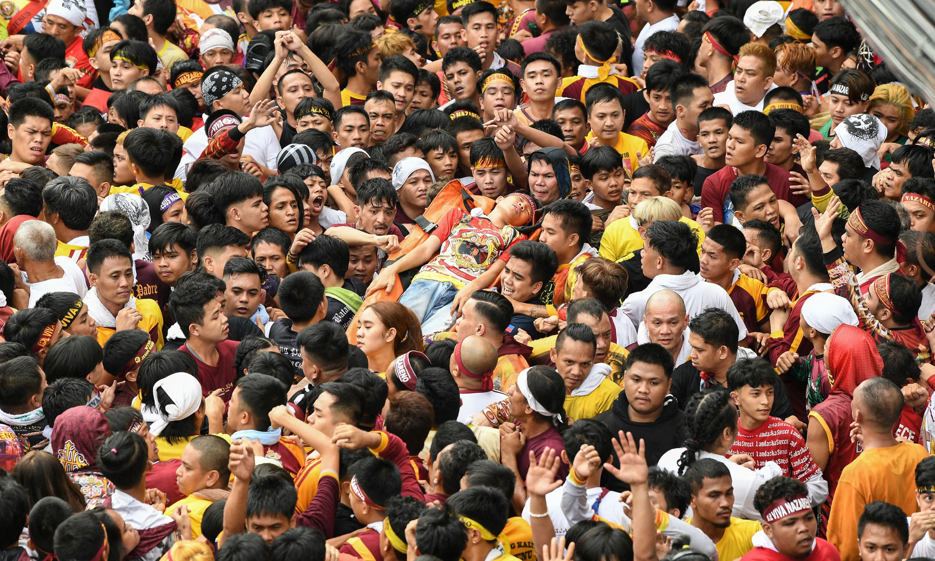 People help emergency personnel carry a Catholic devotee who passed out during an annual religious procession held in honour of the so-called Black Nazarene in Manila on January 9, 2024. Hundreds of thousands of Catholic faithful swarmed a historic statue of Jesus Christ as it was pulled through the streets of the Philippine capital on January 9, in one of the world's biggest displays of religious devotion. (Photo by Ted Aljibe/AFP Photo)
