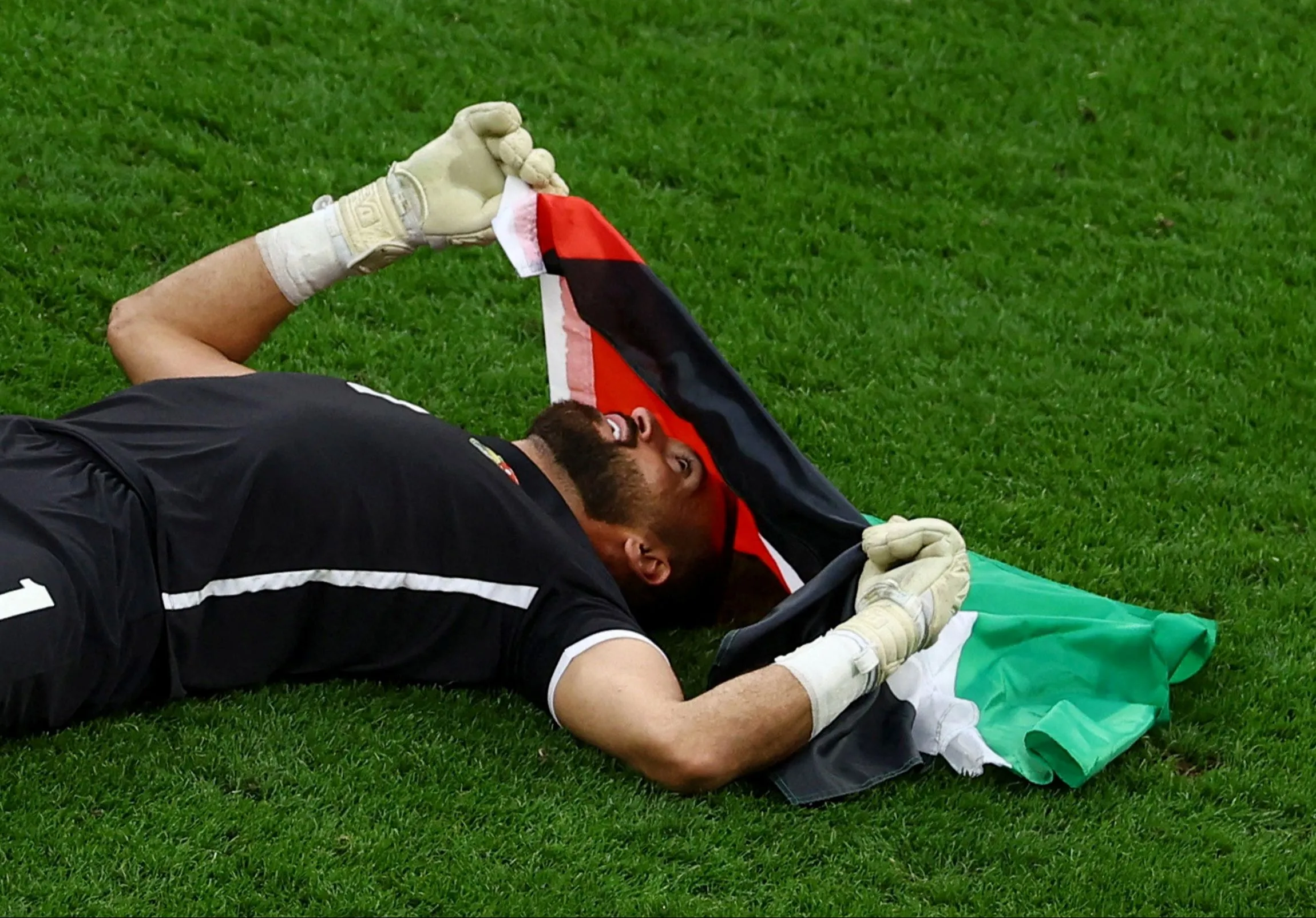 Yazeed Abulaila of Jordan celebrates after the team's victory in the AFC Asian Cup Round of 16 match between Iraq and Jordan at Khalifa International Stadium on January 29, 2024 in Doha, Qatar. (Photo by Molly Darlington/Reuters)