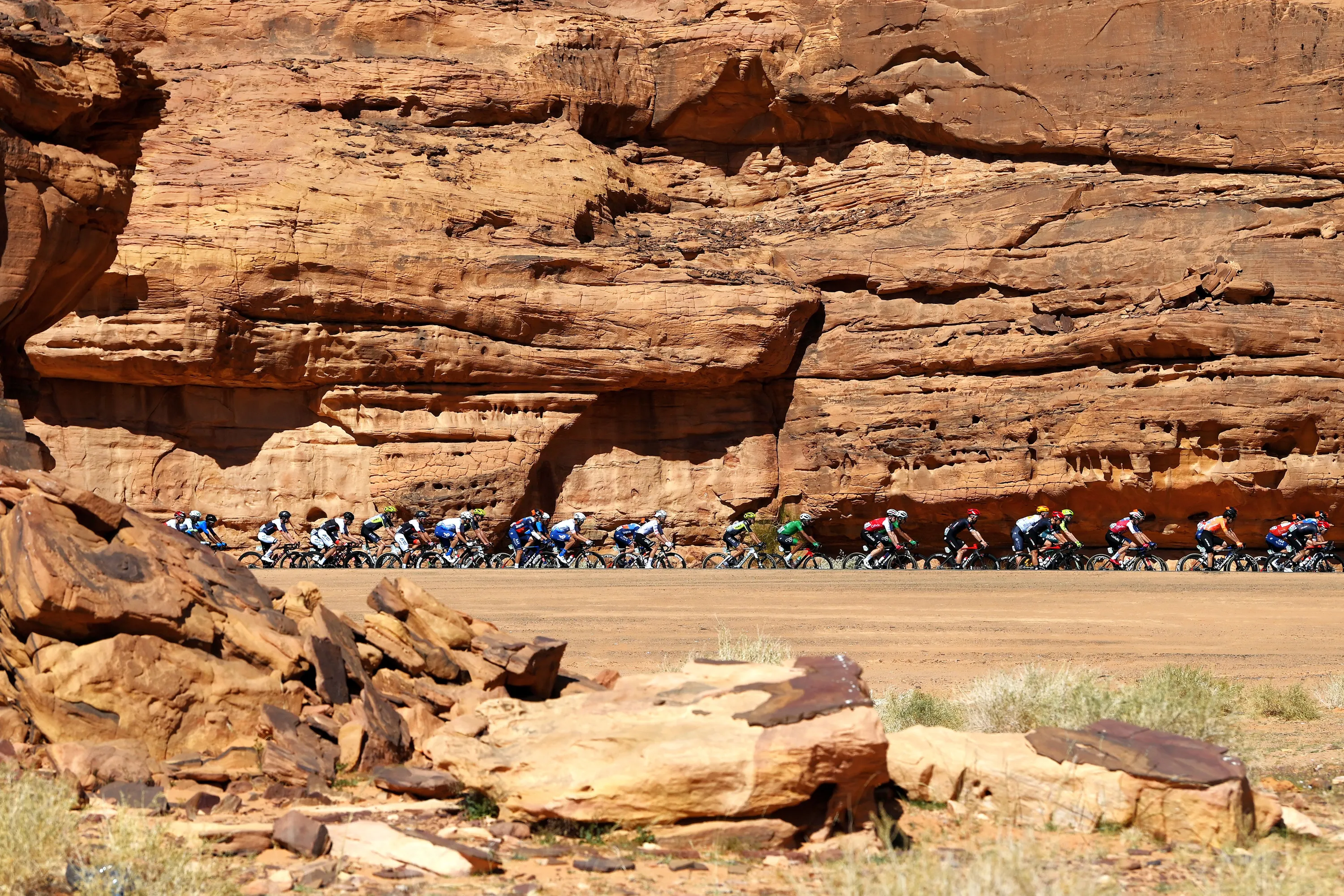 A general view of the peloton passing through a landscape during the 4th AlUla Tour 2024, Stage 2 a 199.1km stage from AlUla Winter Park to Sharaan Nature Reserve 1002m on January 31, 2024 in Sharaan Nature Reserve, Saudi Arabia. (Photo by Alex Broadway/Getty Images)