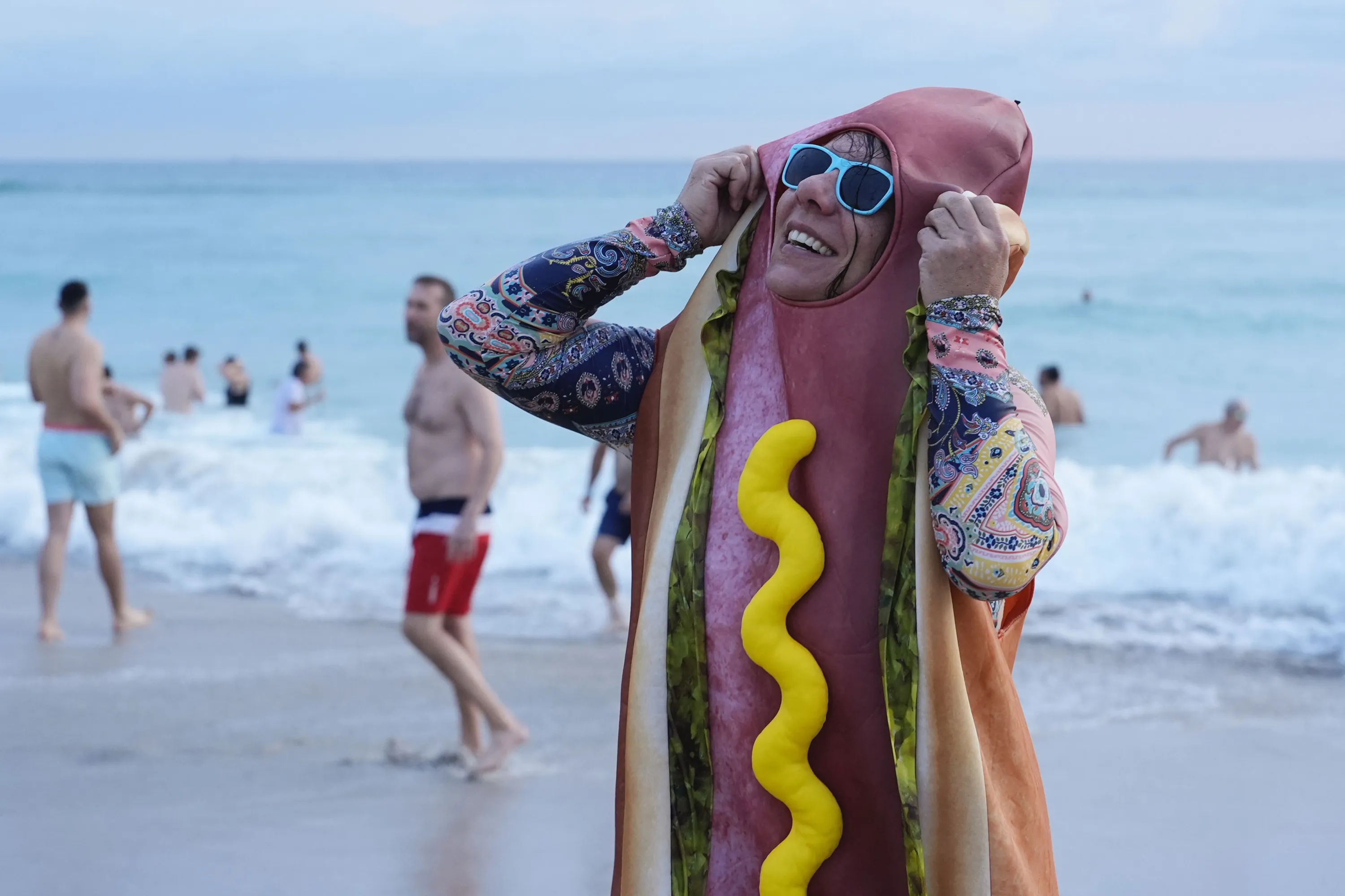 Christina Lusk of Fort Lauderdale adjusts her wet hotdog costume as she emerges from the ocean during a Groundhog Day celebration in Hollywood, Fla., just after dawn on Friday, February 2, 2024. Hollywood's version of Punxsutawney Phil saw his shadow and predicted “six more weeks of tourism” for the area, before dozens of celebrants sang the national anthem then ran into the ocean as part of a local Groundhog Day tradition that dates back twenty years. (Photo by Rebecca Blackwell/AP Photo)