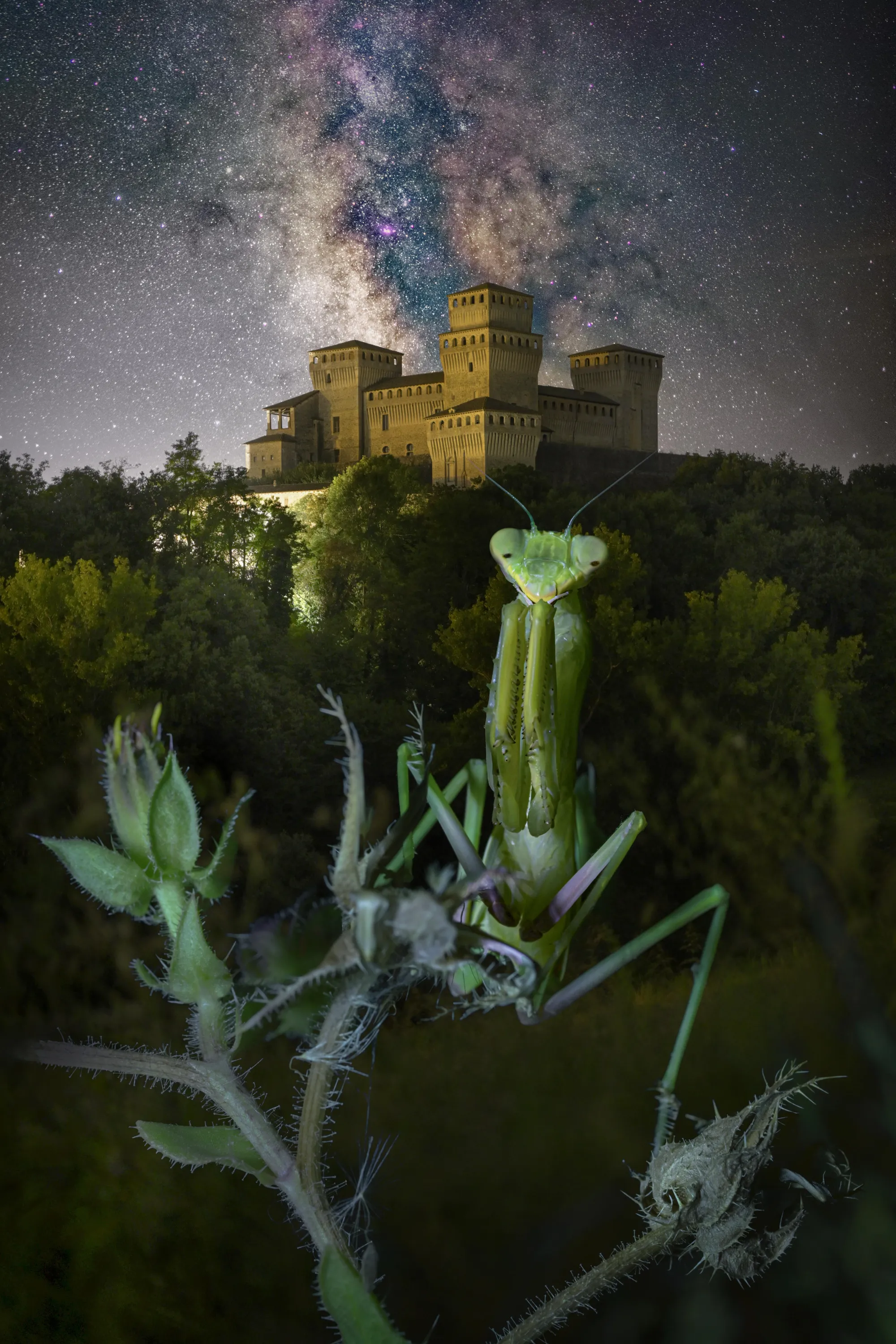 A praying mantis stares into the lens as it is framed by the stars and Torrechiara Castle in Parma, Italy early September 2023. (Photo by Alberto Ghizzi Panizza/Animal News Agency)