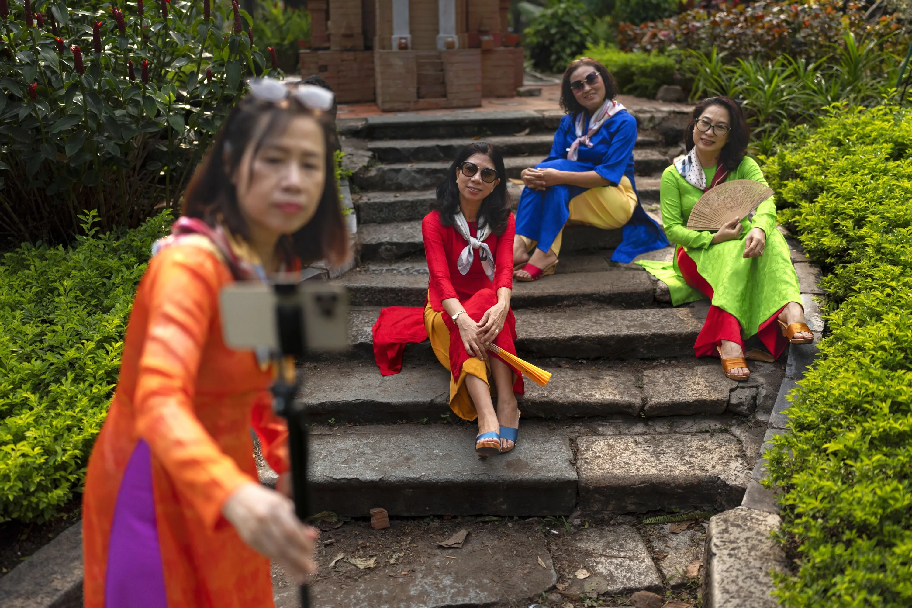 Anh Nguyen, foreground, sets up her phone to take a group photo with her friends at a park in Ho Chi Minh City, Vietnam, January 14, 2024. (Photo by Jae C. Hong/AP Photo)