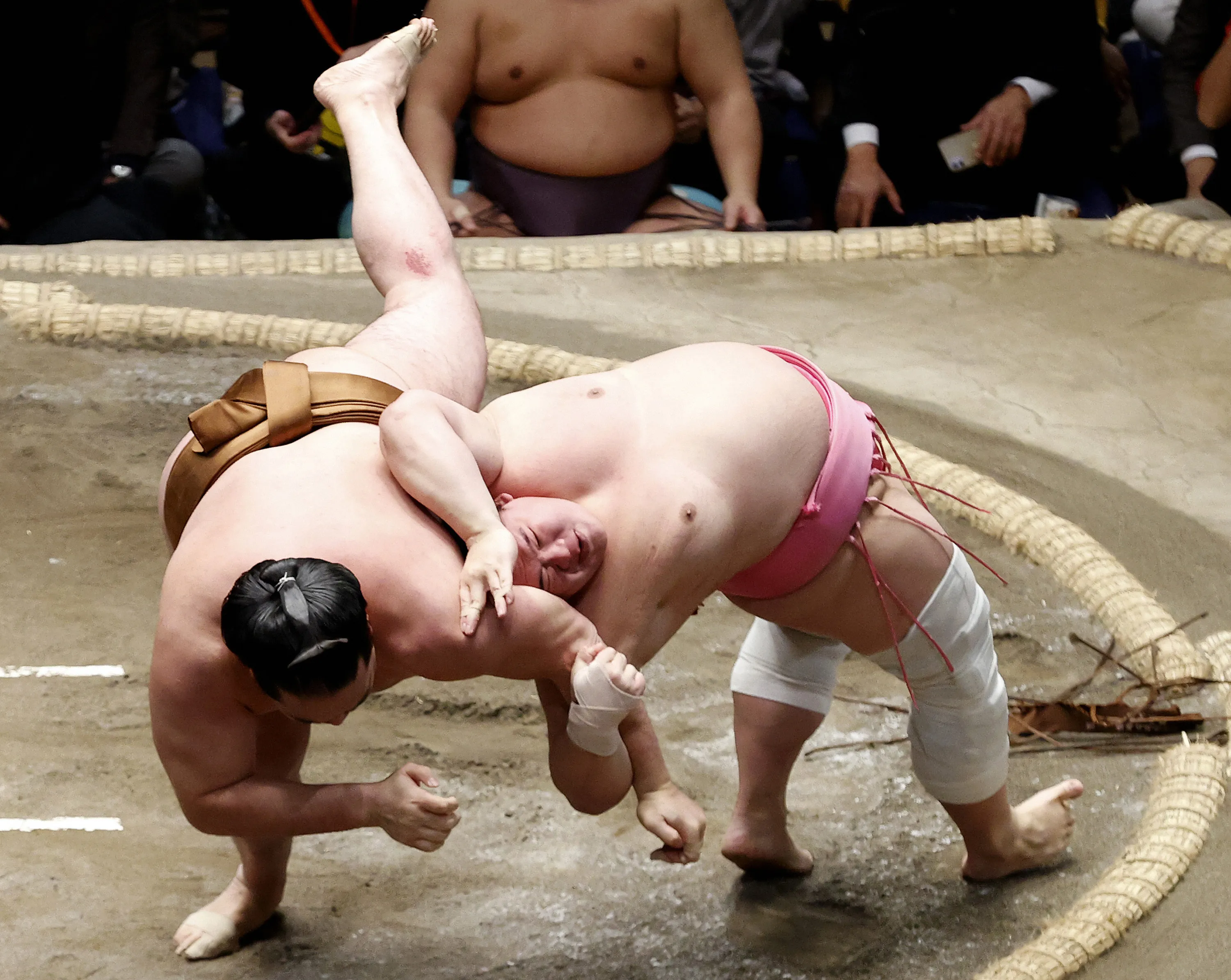 Komusubi Ura (R) throws Ryuden (L) to win on day fifteen of the Grand Sumo New Year Tournament at Ryogoku Kokugikan on January 28, 2024 in Tokyo, Japan. (Photo by The Asahi Shimbun via Getty Images)