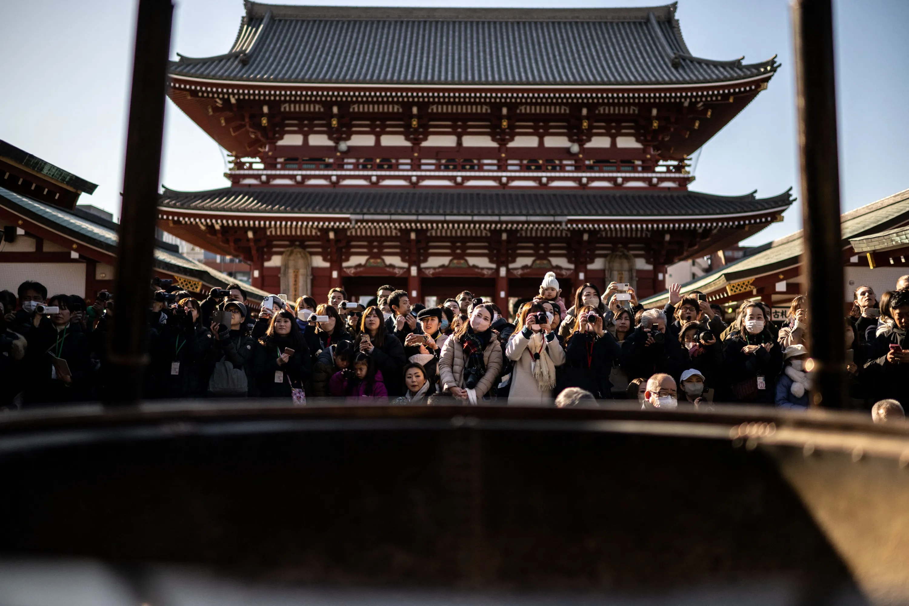 Parents and visitors look on as kindergarten students take part in a bean-throwing ceremony to drive away evil spirits and bring good luck at the annual Setsubun Festival at Sensoji Temple in Tokyo on February 3, 2024. (Photo by Philip Fong/AFP Photo)