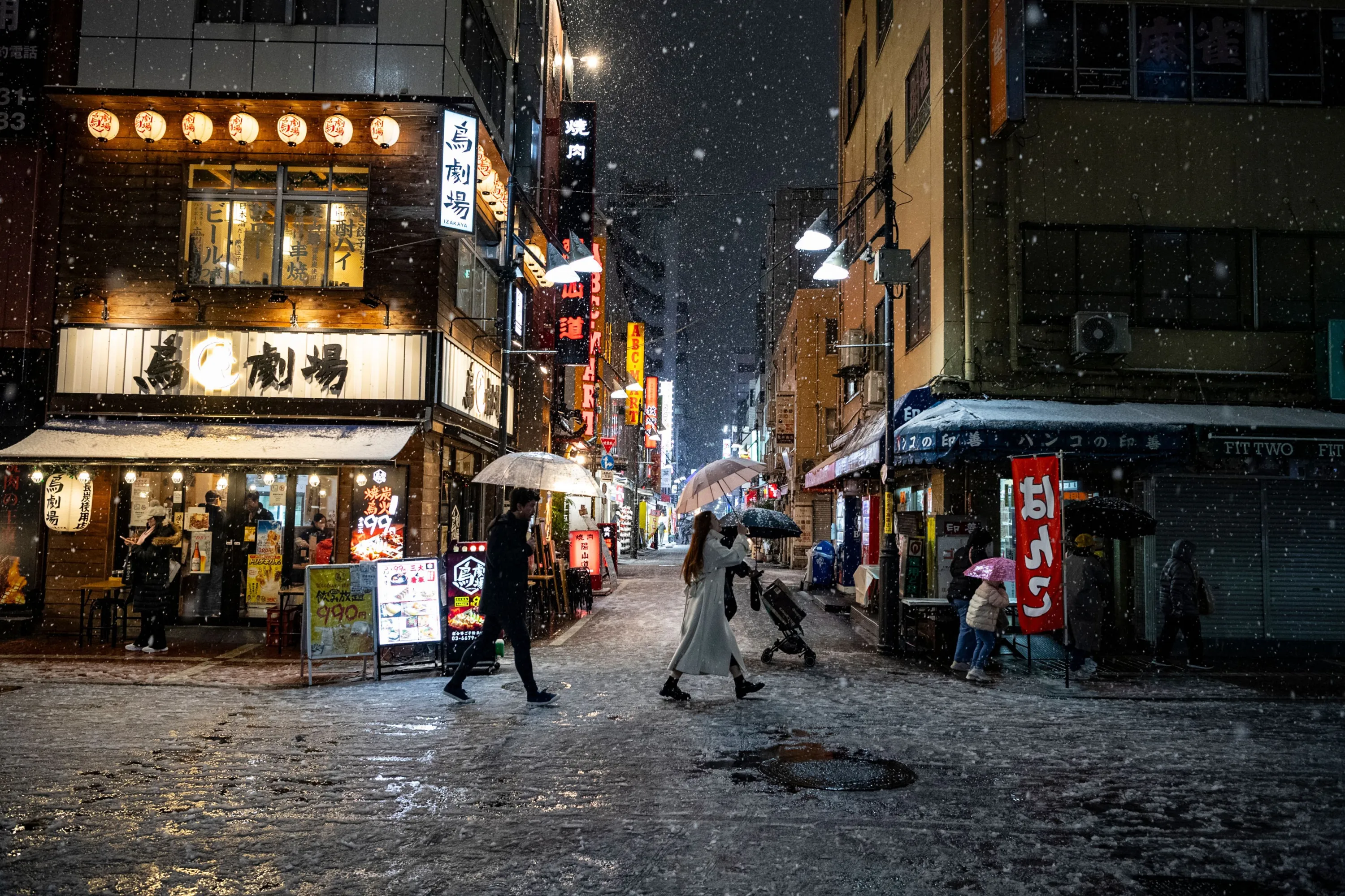 People are walking through a deserted bar area with umbrellas in heavy snow in Tokyo, Japan, on February 5, 2024. (Photo by Yusuke Harada/NurPhoto via Getty Images)