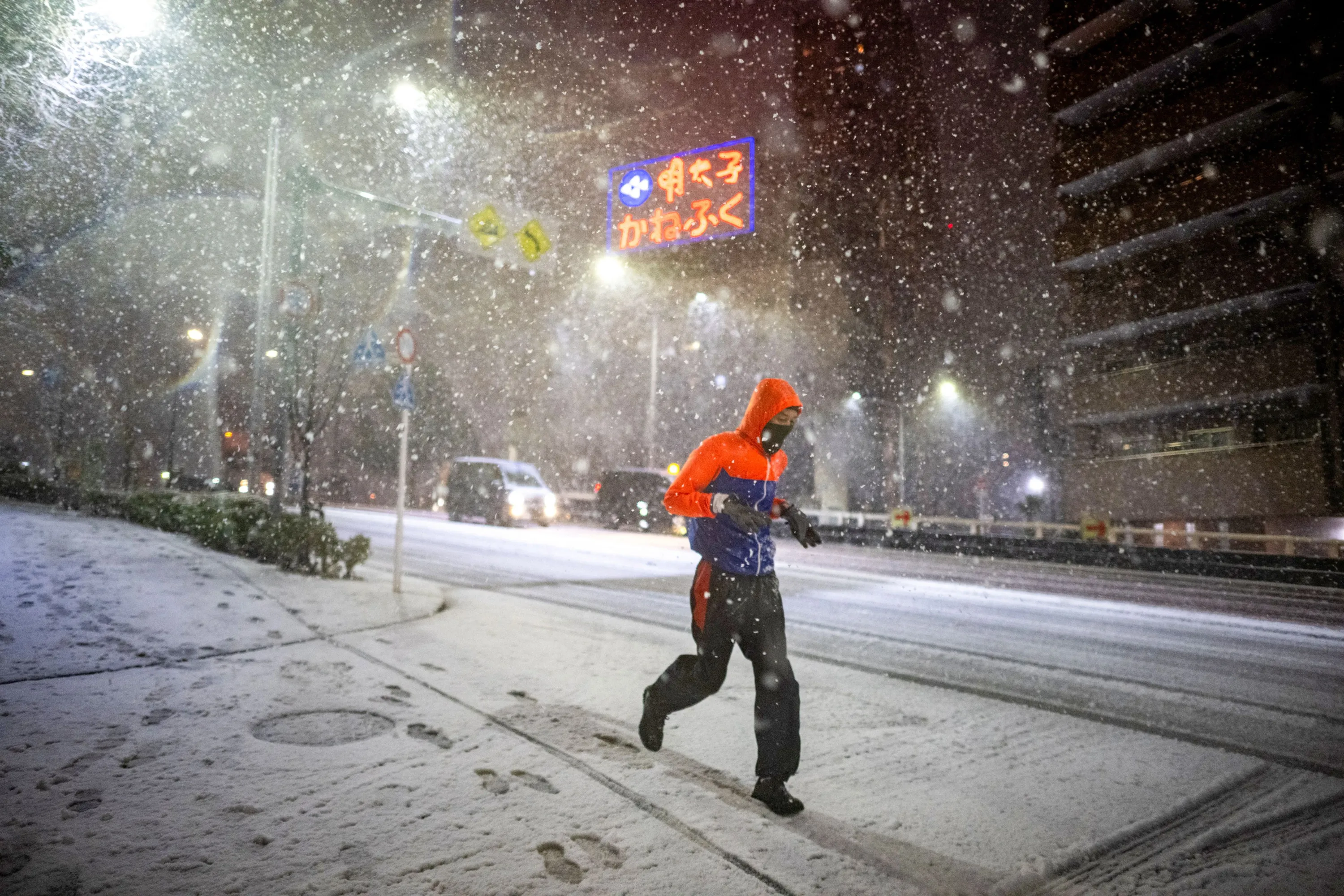 )A man runs amid snowfall in Koto, Tokyo on February 5, 2024. (Photo by Philip Fong/AFP Photo)