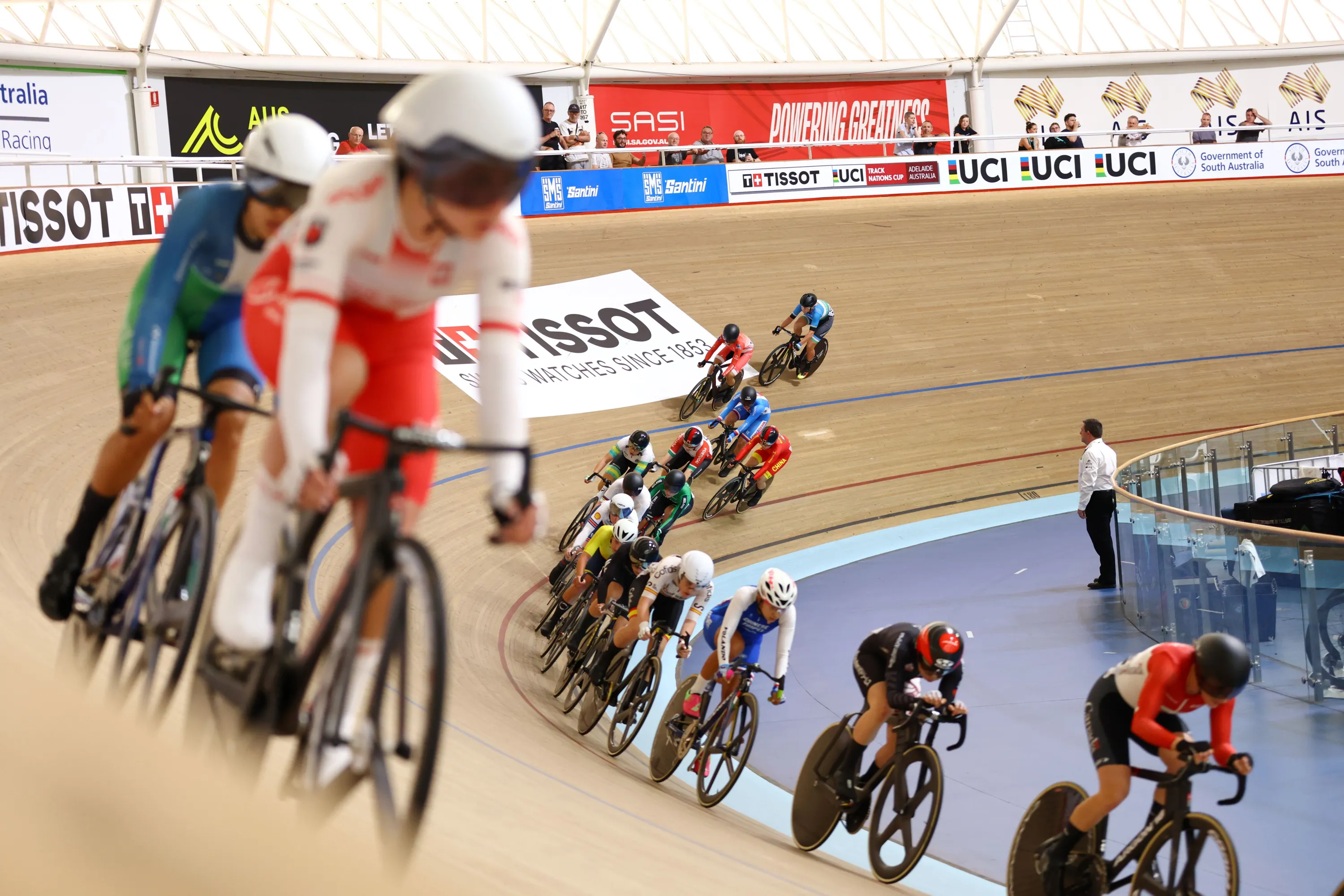Riders compete in the Women’s Elimination race at the 2024 UCI Track Cycling Nations Cup in Adelaide, Australia, 04 February 2024. (Photo by Con Chronis/EPA)