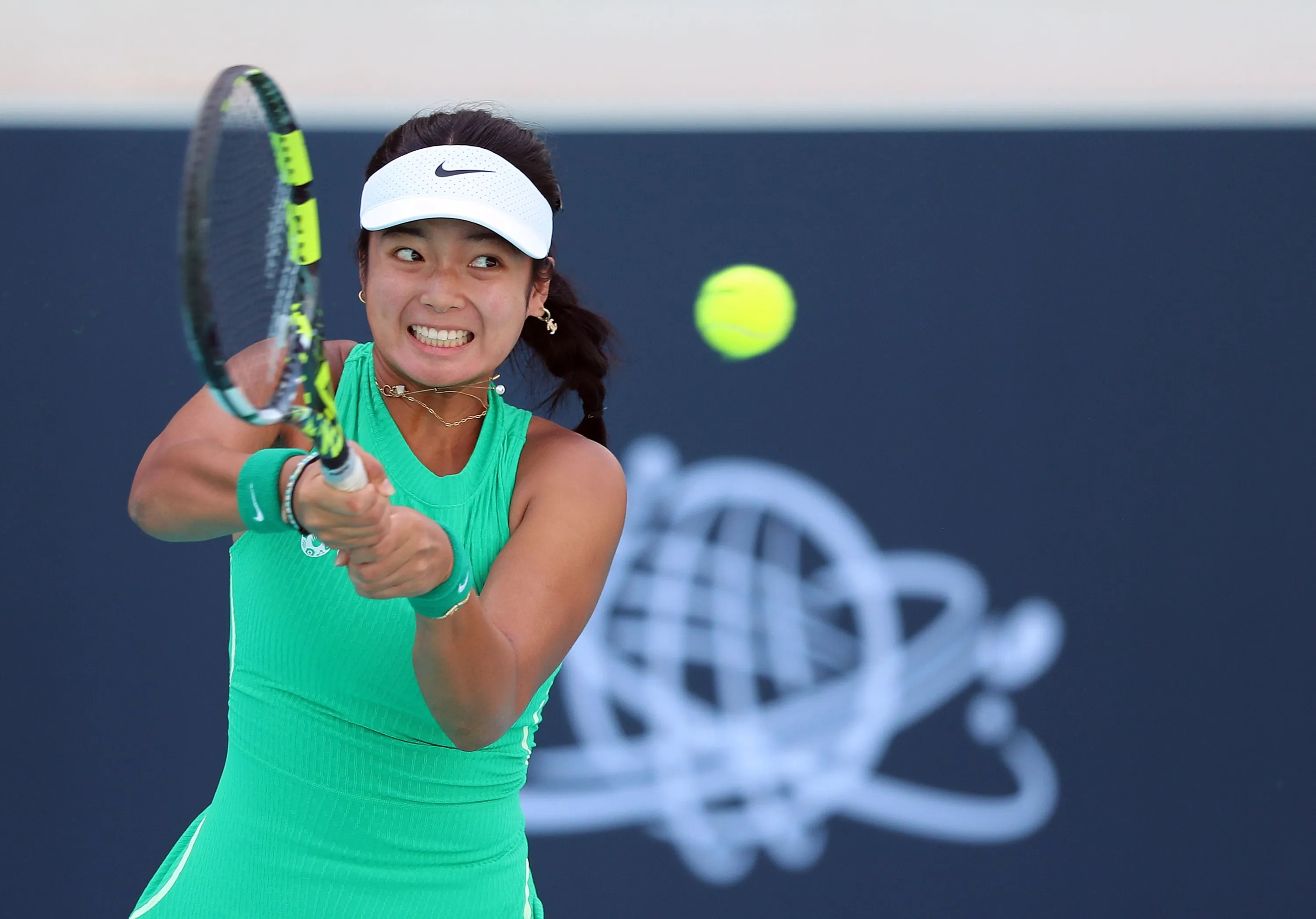 Filipina' Alex Eala returns the ball during her match against Magda Linette in the Mubadala Abu Dhabi Open singles. Zayed Sports City, Abu Dhabi on February 6, 2024. (Photo by Chris Whiteoak/The National)